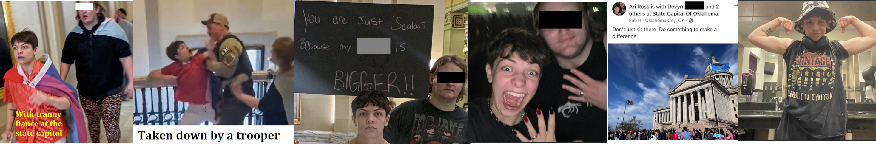 As reported by Andy Ngo and the Post Millennial, Ross is a tranny who was at the Oklahoma state capitol in early 2023 with its fiancé protesting a bill that would ban the prescription of puberty blockers and hormones to children. It threw water on a Republican state rep. and when a State Trooper attempted to arrest it, threw water on the trooper. Its tranny friends set up a GoFundMe to raise money for its legal defense. Ross lives in Ponca City. We're not sure how radical Ross' tranny boyfriend is so we censored his pictures. https://archive.ph/fZAQ9 https://archive.ph/gJwNu