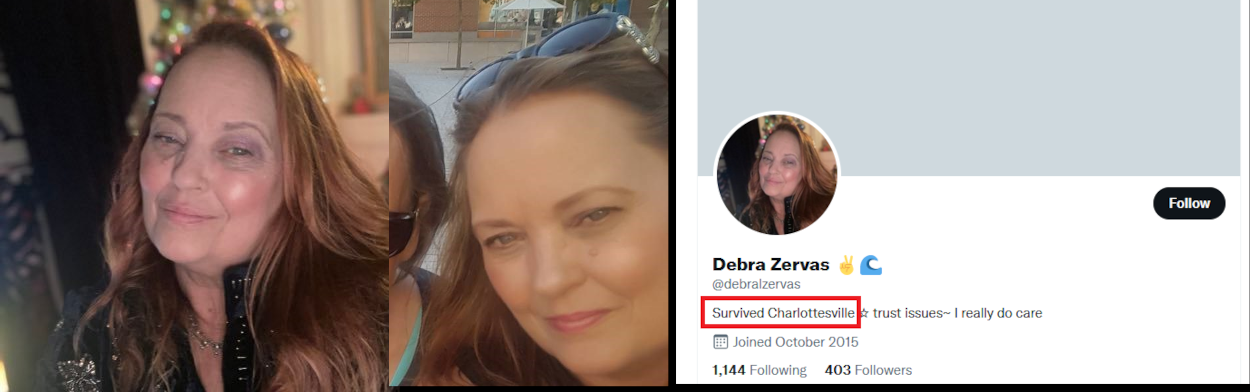 Debra Louise Zervas (DOB: 01/06/61, Sucks for her that the alt-right crashed her birthday) attended the Charlottesville Unite the Right counter-protest. She runs some sort of masonry business and took out a pandemic loan from the Small Business Administration. She pleaded no contest to some sort of felony charge related to welfare in 1986. She filed for bankruptcy in 2009. Zervas lives in Norfolk. https://archive.ph/jewox https://archive.ph/8buIN
