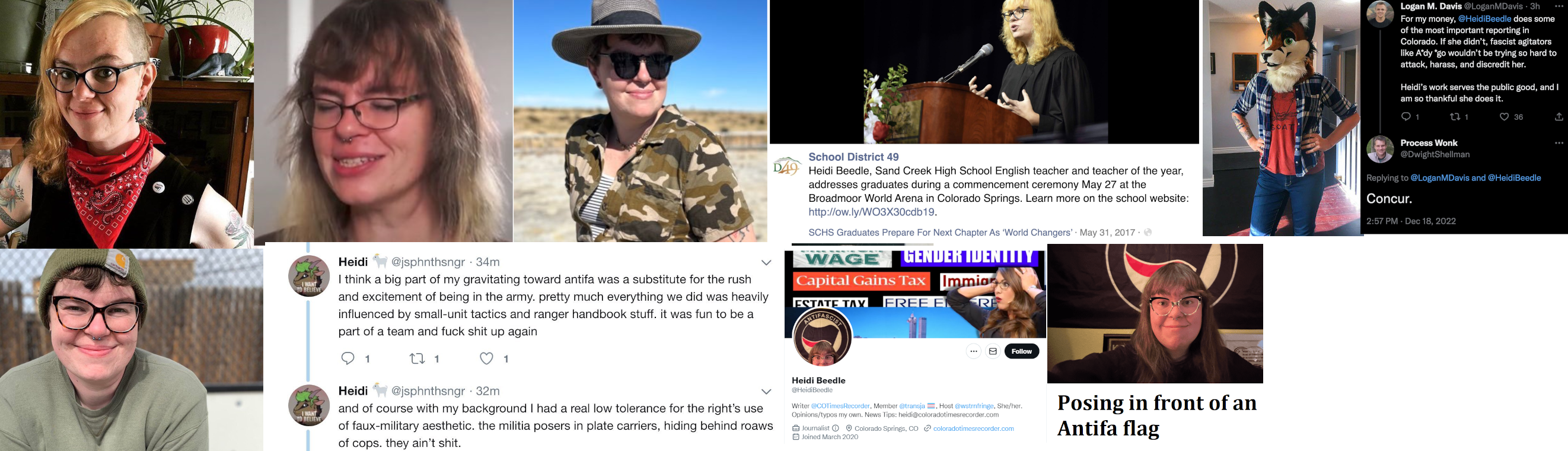 Formerly Sean Beedle. It's trans and it ran the Colorado Springs Antifa cell's Twitter account before it was suspended for encouraging violence. Its hobby is doing citizen "journalism" to expose supposedly fascist organizations in the area. The Antifa Twitter account allegedly promoted violent assaults on people they didn't like. Beedle is also allegedly a furry, someone who dresses up as an animal to get sexual kicks. Bizarrely, Colorado seems to have a genuine problem with furry teachers in the schools (see link). It formerly worked as an English teacher at Sand Creek High School in Colorado Springs and was teacher of the year once. Beedle now works for the Colorado Times Recorder. https://archive.ph/Lv2Ei https://archive.ph/i3qVf https://archive.ph/5s4i8 http://web.archive.org/web/20191015040141/https://twitter.com/jsphnthsngr/status/1183938325033304067 https://archive.ph/axu2X (Colorado furry schoolteachers)