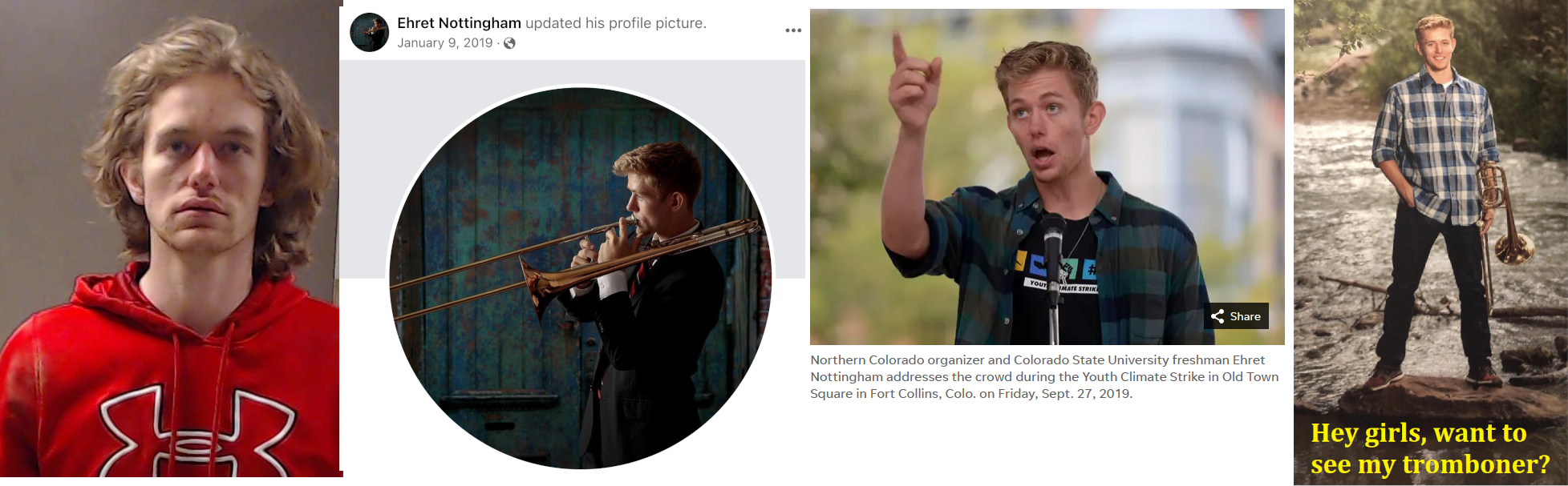 Ehret William Nottingham is a poly-sci student at Colorado State University who travelled to Atlanta to "defend" the forest from police. Unfortunately for Nottingham, he was arrested at an early March 2023 riot and held on domestic terrorism charges. He was said to be active in radical environmental politics in high school. Nottingham participated in a 2019 "climate strike" in Fort Collins. His main claim to fame, other than being a violent Antifa, is his skill as a tromboner. He's probably a member of the left-wing Disciples of Christ denomination. They gave him an educational fellowship. He's from Loveland but lives in a townhouse in Fort Collins (when he's not imprisoned). https://archive.ph/PhS9w https://archive.ph/KGHAE https://archive.ph/rKqua https://archive.ph/a14PY https://www.youtube.com/watch?v=wO3ySU2BtjI&ab_channel=SSCDirector Nottingham was supposedly a witness to the June 28, 2020 incident where BLM rioters shot at a jeep as it tried to pass through a large protestor on the highway. Nottingham was quoted in a Daily Mail article on the subject condemning one of the passengers and encouraging his alma matter to formally denounce the victim (who briefly attended the same school). https://www.dailymail.co.uk/news/article-8583183/Passenger-Jeep-drove-Colorado-BLM-protesters-speaks-out.html
