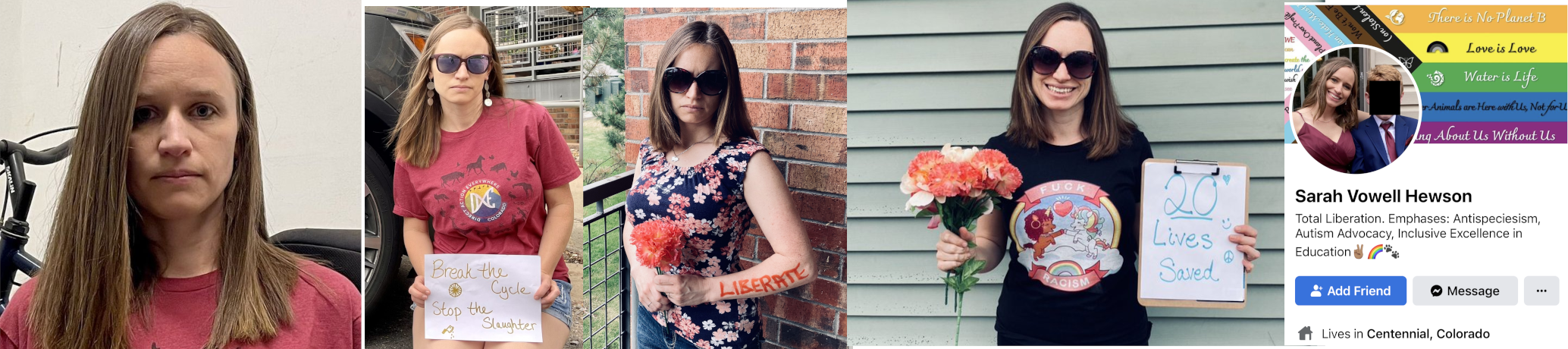 Sarah Vowell Hewson, aka Sarah Joy Hewson, (DOB: 08/18/83) is an organizer for the Denver chapter of the radical animal rights group Direct Action Everywhere (DxE). She was arrested at an "action" on a Sonoma County (CA) farm in the late 2010s, but charges appear to have been dropped. She has a 2017 trespassing charge in Denver that may be protest related. She works as a teacher and won a teacher appreciation award in 2018. Her son is autistic, and she brought him to several protests. Hewson claims to live in Centennial but may live in Parker, just south of Centennial. https://archive.ph/lXRbp#selection-1185.839-1185.852 https://archive.ph/ZKwj9, https://archive.ph/2x0OM, https://archive.ph/8WsGz