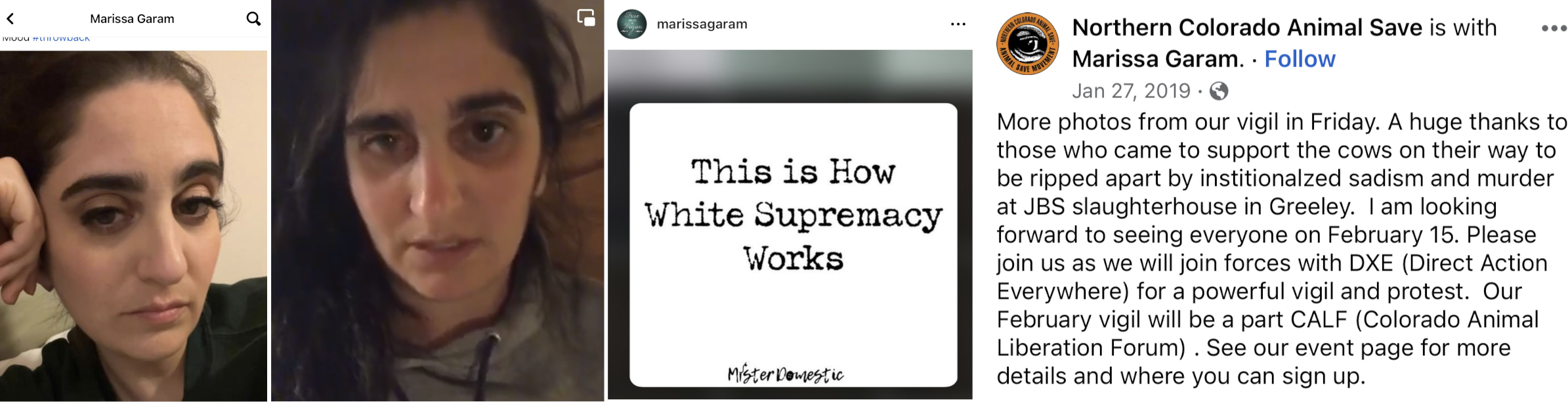 She's a member of the radical animal rights group Direct Action Everywhere (DxE) who was arrested at a direct action in Sonoma County (CA) in the late 2010s. She's Jewish but has posted anti-Israel memes on Instagram. She may live in Colorado Springs. https://archive.ph/lXRbp#selection-1185.604-1185.617 https://www.tumblr.com/marissagaram