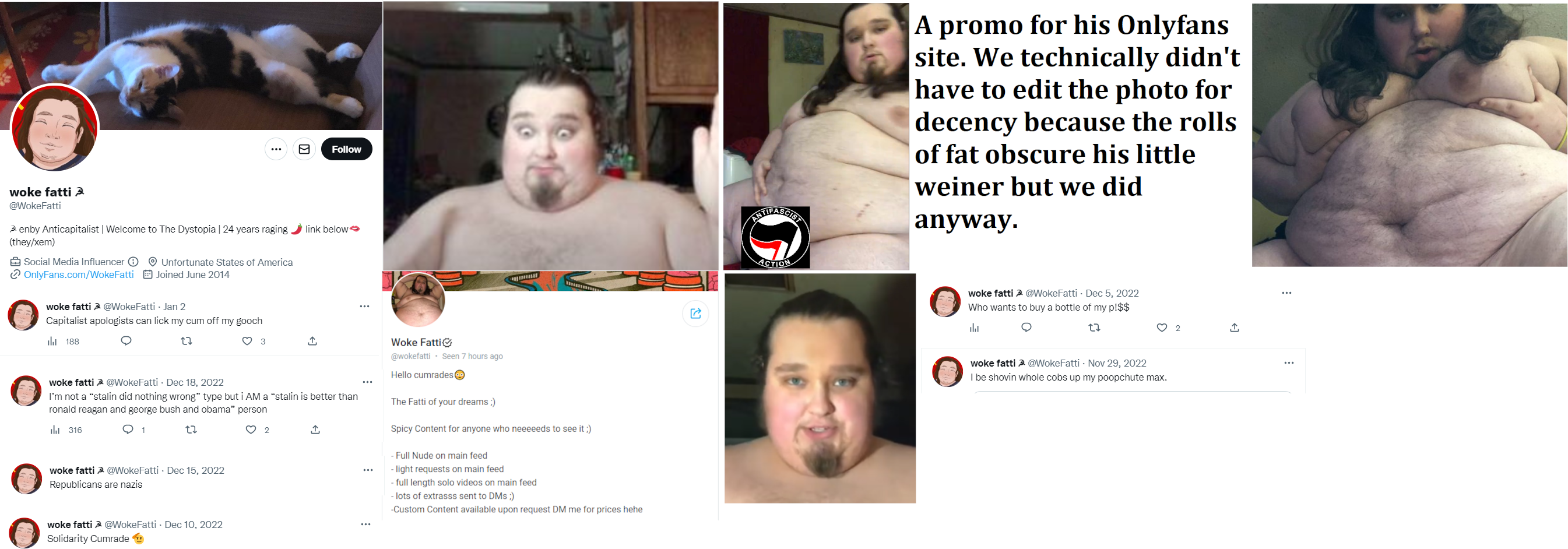 Jack A. Caroselli (DOB: 07/16/98) is a 400 lb. monstrosity, Antifa influencer and online porn star. He has a commie hammer & sickle in his Twitter profile and refers to himself as an enby (non-binary) anticapitalist. Given his weight, it's probably safe to assume he never attended a riot. He refers to his Antifa friends as "cumrades" on his OnlyFans page. Caroselli claims to be disabled from work but given his extreme bulk, it's doubtful he's ever worked a real job. He's a dutiful son who organized a GoFundMe for his pop who raised him right. Dad was in the hospital for heart disease, diabetes, COPD (lungs) and emphysema. Caroselli lives in what appears to be a double-wide trailer or perhaps cheap manufactured housing in the Indianapolis suburb of Noblesville. https://archive.ph/xkbhg https://onlyfans.com/wokefatti https://linktr.ee/WokeFatti