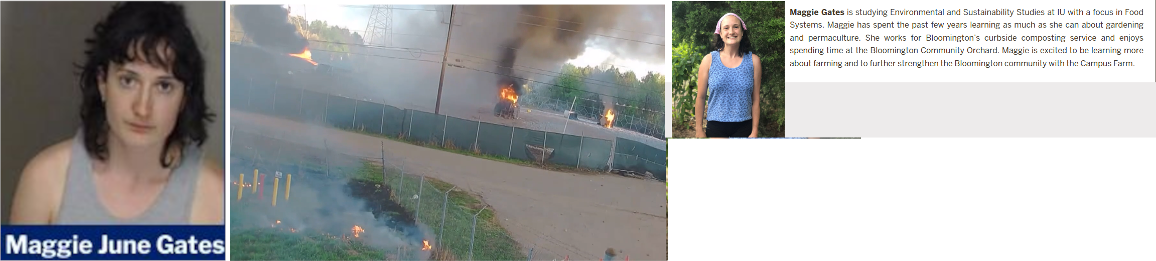 Maggie June Gates was arrested at a March 2023 Antifa riot at the Cop City complex in Atlanta and charged with domestic terrorism. Gates was an environmental and sustainability studies student at Indiana University. She lived with her parents at their Bloomington home before she left for Atlanta. https://archive.ph/PhS9w https://archive.ph/ZAlgR