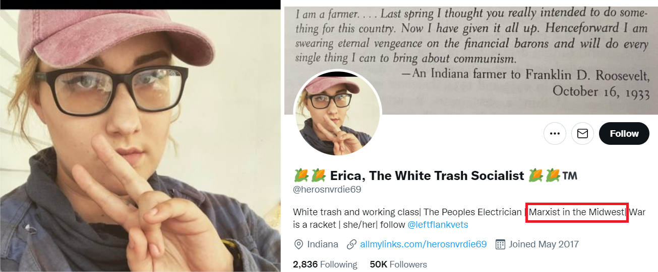 DOB: 04/01/95. She's a retired Navy vet who self-identifies as a Marxist on Twitter. She's very anti-military now. Gordon is a member of Left Flank Veterans, an anti-war group. She worked as a medic at the Kenosha riots and patched up Antifa. It sucks for her she couldn't do much for the pedophile and the wife beater shot by Rittenhouse. In addition to Kenosha, she admits to working riots in Minneapolis, Detroit and Virginia Beach. Gordon claimed to have been a Navy medic in a newspaper interview, but she said she was a sonar technician in a podcast interview. She served on a ship but claims she suffers from PTSD. She's also the communications director for Our United Left. Gordon claims to have grown up poor and was subject to the "poverty draft" into the military. Her last known address was in Indianapolis. She may work as an electrician. https://archive.ph/Xzfzu https://archive.ph/CH1lC https://anchor.fm/AmpedUp/episodes/Erica-Gordon-gets-Amped-Up-with-Ryan-Knight-emf9q9