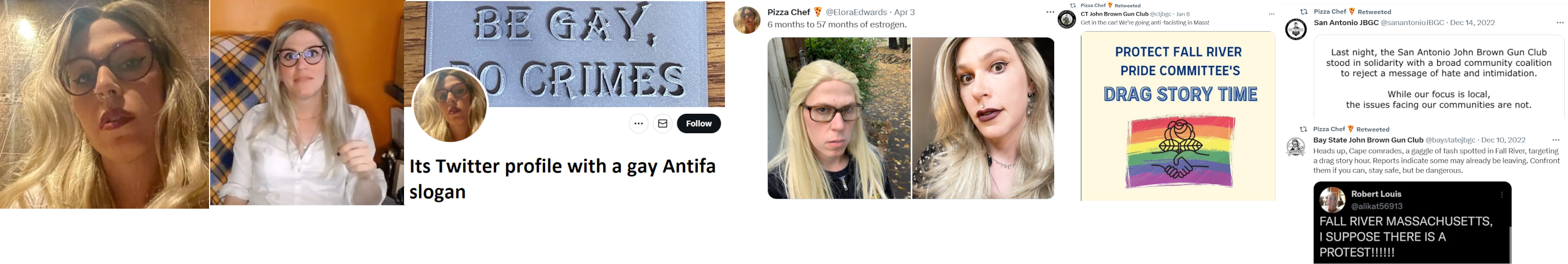 It's a left-wing tranny from Massachusetts and possible SRA or JBGC member that claims on Twitter to be here to fight fascists. Edwards follows over a dozen SRA and JBGC chapters on Twitter. Edwards made some YT vids to teach trannies how to talk more like a woman. It claims to have lost most of its friends when it came out as trans. It works as a chef and may run a restaurant. The first name it uses is probably a made-up tranny name. Edwards may live in the Boston area; it's posted some on-the-ground images of Boston protests.