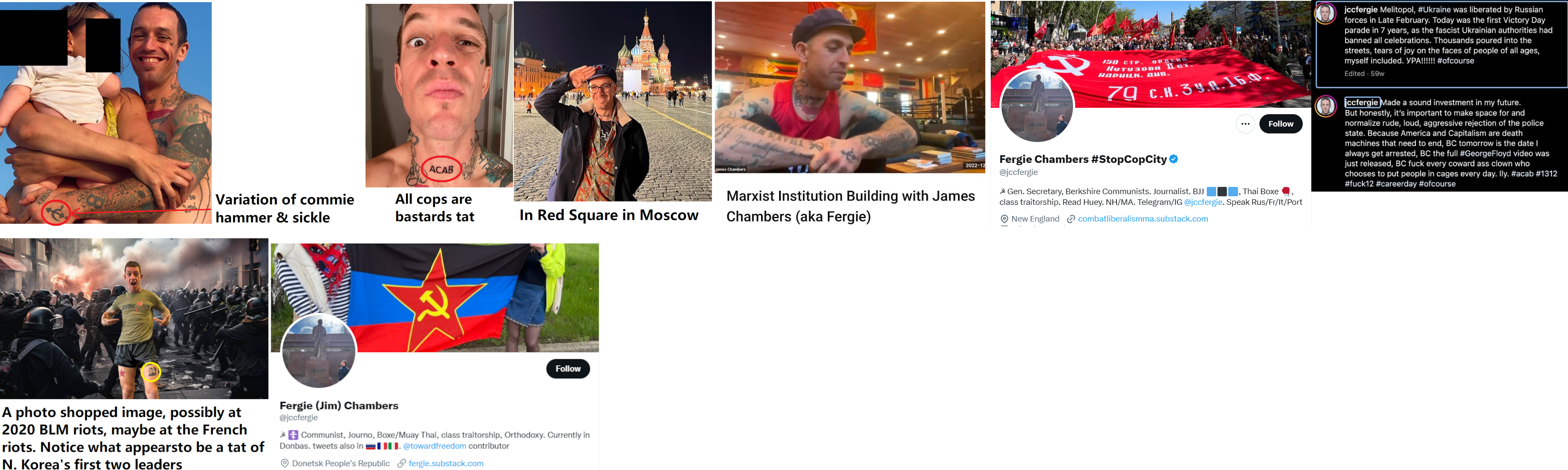 James "Jim" Cox Chambers, Jr. aka "Fergie" (born Jan. '85) is a communist and an heir to the Cox Communications fortune. He said his family's support for the Cop City complex in Atlanta forced him to cut ties with his family (but kept the $$$). Chambers claims his personal net worth is hundreds of millions of dollars. His family is from Atlanta and his father owns the Atlanta Hawks. Chambers seems to want to use his wealth to support communism in the U.S. He writes, "I'm building a network of comrades who can help me be accountable to the socialized allocation of this capital, so as to assist in a long-term strategy of building internationalism and building strong cadre in the North Atlantic." He's probably one of the people funding Atlanta area bail funds. Chambers is General Secretary of the Berkshire Communists. His most notable physical feature are the large number of tattoos he has including an ACAB tat on his neck, a modified hammer & sickle on his left hand and Chambers lives in a fairly modest home for a millionaire near Alford in the Berkshires. https://archive.ph/zcrel https://combatliberalismma.substack.com/ Claims to live in New Hampshire where his AR style weapon is legal, and also for tax reasons. Claims to have another Communist "People's Gym" somewhere in New Hampshire and is centering his operations in that state. Chambers self admits in media interviews to serious mental health issues and an attempted suicide. He also mentions having committed domestic battery against his former wife. These admissions should disqualify him from owning or purchasing firearms. Extensive background information through online posting (X), media interviews (https://www.berkshireeagle.com/news/local/james-fergie-chambers-cox-media-berkshire-communists-alford-hamas-antisemitism-israel-palestine/article_87042bcc-7fd5-11ee-99c1-5ff7316e4530.html Owns and operates a Communist "Training Center" in Alford Massachusetts for physical fitness, martial arts, and allegedly firearms instruction. The training facility is called the "People's Gym" . Subject reports that he actually resides in New Hampshire where AR type firearms are legal, where he has established another "People's Gym" training facility. New Hampshire specifics are unknown and appear to be closely guarded and OSINT searching turned up no connections. Chambers is a multi-millionaire trust fund kid who is estranged from the source of his wealth, the COX media empire in Atlanta. He is funding left wing activities through at least 2 LLC's . Cloud Kingdom and Cloud Kingdom 2020 as well as something called the Babochki Collective. Chambers has made some implied threats against white Americans that were quoted in the Berkshire Eagle interview; "We need to make all of wyt america” — as in, white America — “afraid that everything they have stolen is going to be burned to the ground. That’s what makes them listen.” Chambers has established another of his "People's Gyms" for weapons and martial arts training at Old Etna Rd, Lebanon, NH as profiled on Instagram; https://www.instagram.com/uppervalleypeoplesgym/ This appears to be an industrial park location on the north side of this small city. Chambers has previously intimated that he lives on a mountain in NH, though specifics of this are still unknown. The selection of this part of New Hampshire makes sense since the area hosts Dartmouth College and has been a hotbed of ANTIFA organizing and related left wing activity for many years. He has converted to Islam. https://www.facebook.com/jim.chambers2/posts/pfbid02hrGaEGvGV1dTvBPVzrdVcbFTZJwZoTwMurcukT56iojNzL8ZrNHMr8mtzwkryURsl He is currently based in Tunisia. FB post states, "I have since had many Muslim strangers (as I’m currently based in North Africa)." FB and Twitter profiles state "Tunis" as a location. Online property records suggest he lived at 109 Eastman Hill Road, Lebanon, NH 03766 then moved to 40 Follensbee Road, Enfield, NH 03748. Both properties have since been sold. If they were in fact owned by him, judging by the date of the most recent sale, it is likely because of his move to Tunisia. His gym in Alford has been ordered to stop operation. https://www.berkshireeagle.com/news/southern_berkshires/alford-berkshire-communists-peoples-gym-fergie-chambers-zoning/article_2c86499a-992b-11ee-b4dc-a7f35fdc48aa.html According to an 11/9/23 Facebook post, he started the Babochki Collective for funding, propaganda and political education, etc He was ordered to shut down the People's Gym in Alford, MA. https://www.berkshireeagle.com/news/southern_berkshires/alford-berkshire-communists-peoples-gym-fergie-chambers-zoning/article_2c86499a-992b-11ee-b4dc-a7f35fdc48aa.html The status of the Berkshire communists is unclear at this time. A very detailed background report and update on Chambers has been published in Rolling Stone. There are intimate details about his background to include personal relationships and personality quirks. His support circle of cutouts that run his operations for him as far back as the Madison Georgia commune are identified. Recent incidents with law enforcement in ALford Mass and in New Hampshire stemming from a property damage attack on an Israeli military industrial site are also discussed. https://www.rollingstone.com/culture/culture-features/fergie-chambers-cox-enterprises-heir-overthrow-us-1234983156/