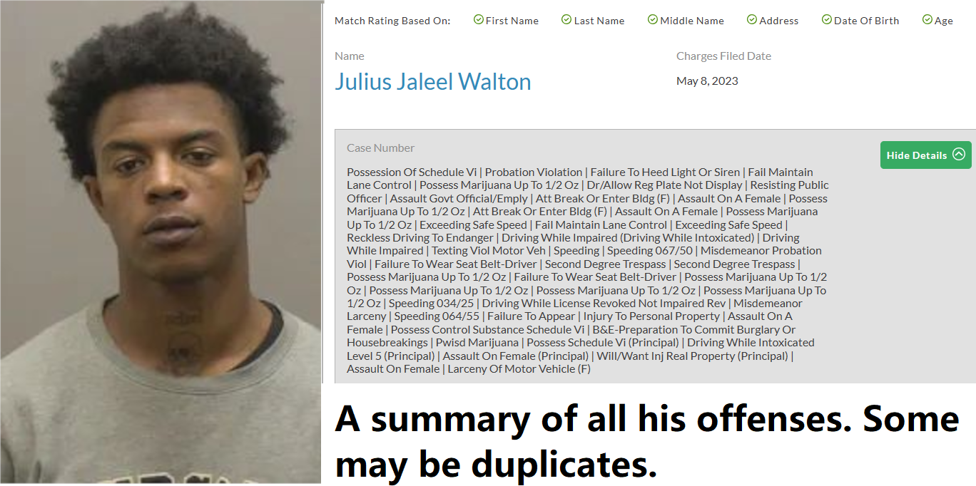 Julius Jaleel Walton (DOB: 03/03/97) was arrested at an October 2020 BLM protest of a Confederate monument. He was charged with assaulting a public official and resisting a public officer. This fine young man has a long list of prior arrests for crimes including possession of marijuana, injury to personal property, failure to appear, attempted breaking and entering, assault on a female, preparation to commit burglary, larceny of motor vehicle, reckless driving to endanger and trespassing. He lives in Mebane with his parents. https://archive.ph/u8unu#selection-1499.3-1499.23