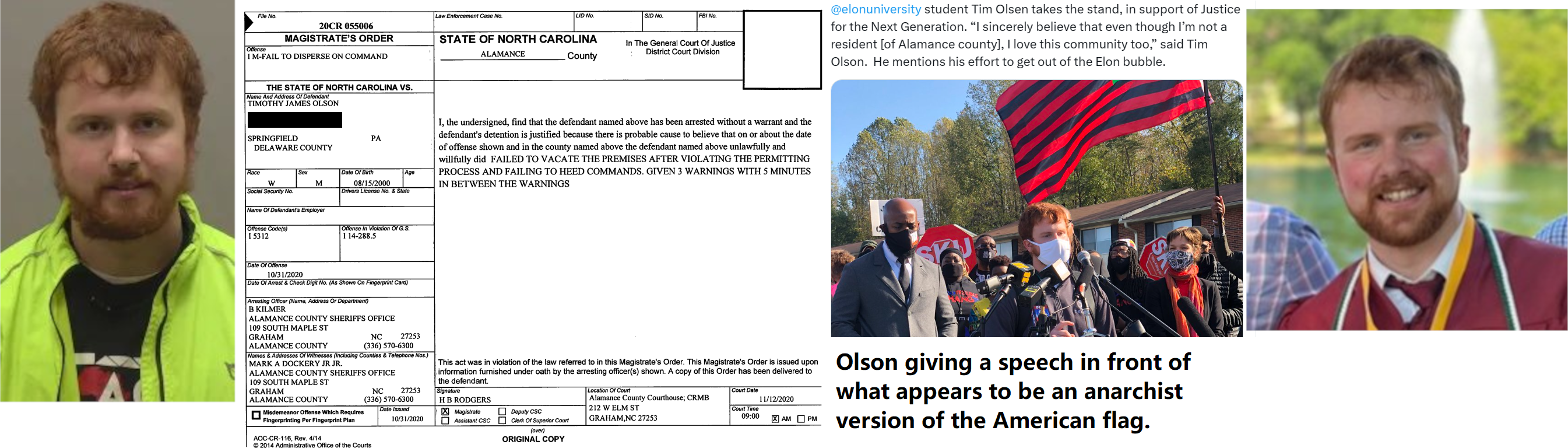 Timothy “Tim” James Olson (DOB: 08/15/20) was an honors physics student at Elon University in North Carolina when he was arrested at an October 2020 BLM protest of a Confederate monument. He’s originally from Springfield, Pennsylvania but may now live in the Greensboro, NC area now. https://archive.ph/u8unu https://www.linkedin.com/in/tjolson628