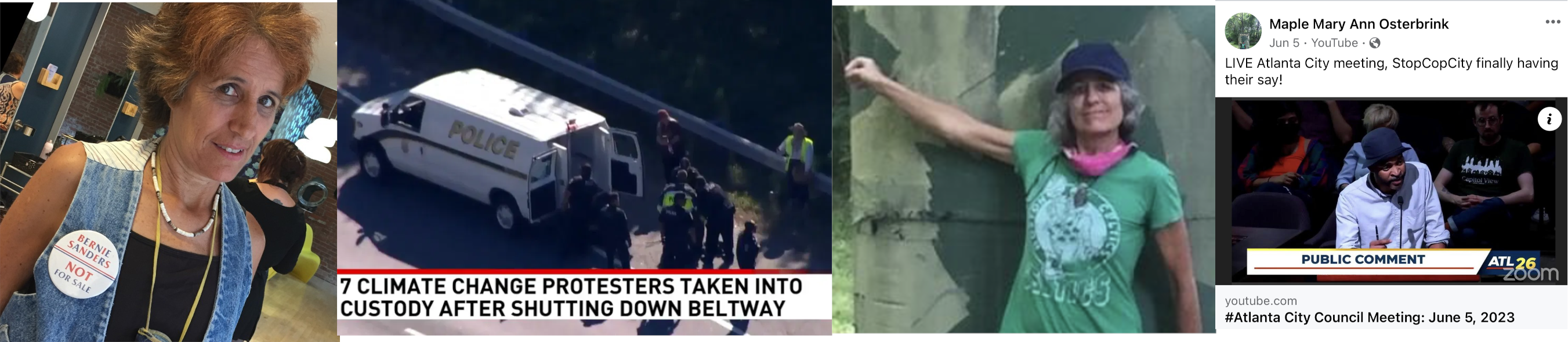 Mary Ann Osterbrink, aka "Maple" (DOB: 07/25/54) is a member of the radical group Declare Emergency and was arrested for blocking traffic on a D.C. freeway on Columbus Day in 2022. She was charged with disturbing the peace. She has several priors that may be protest related. Osterbrink seems to be an all-around leftist and supports radical Cornell West, the probable Green Party candidate in 2024. She's also posted stop Cop City messages on FB. She worked as a special ed teacher. Her last known address was an apartment in Chapel Hill. https://archive.ph/yzz1P#selection-1361.0-1361.15 https://www.linkedin.com/in/maple-mary-ann-osterbrink-1ba70640