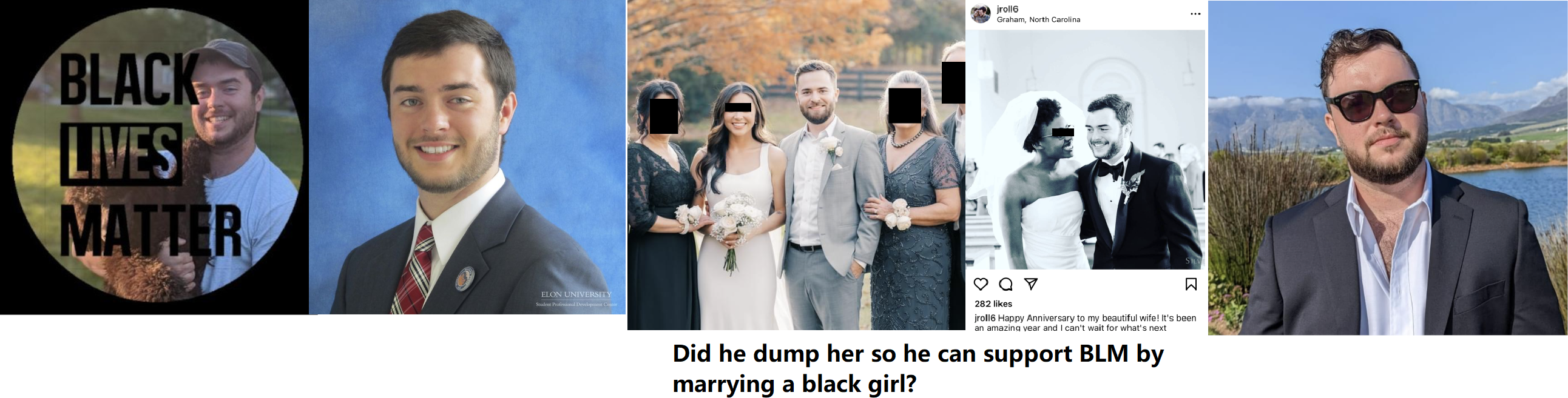 Jensen Holland Roll (DOB: 09/15/93) was arrested at an October 2020 BLM protest in Graham and charged with impeding traffic. The protesters were pissed off about a Confederate monument at the courthouse. He seems to have jumped on the BLM bandwagon as early as 2016, before it was trendy. Roll attended Elon University where he majored in social entrepreneurship and works as a building contractor. He lives in a modest old house in Graham. Strangely, he's seen as the groom in two wedding photos; one with a half-Asian chick and another with a black chick. He may have dumped the Asian so he could be woke and marry a black girl. https://archive.ph/u8unu#selection-1479.2-1479.20 https://archive.ph/jqgzH
