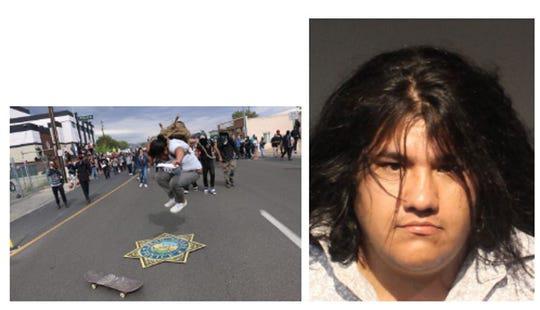https://mynews4.com/news/local/reno-police-arrest-three-rioters-who-attacked-police-station-city-hall-saturday 25-year-old Leonel Jimenez was arrested for burglary and felony destruction of property from his involvement in the City Hall incident. Police say he was also involved in the police station incident as evidenced by this photo that shows him stomping on the police department badge replica.