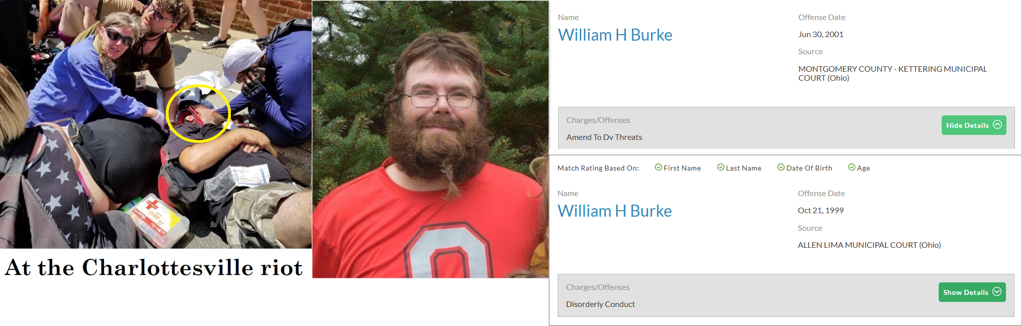 William "Bill" Harold Burke (DOB: 08/13/77) participated in the Charlottesville Unite the Right counter protest and was injured by the runaway car. He's a member of the International Socialist Organization, Athens, OH chapter. He's hardly an innocent bystander. He was charged with making domestic violence threats in 2001 and has a charge for disorderly conduct. His last known address was in Hockingport. https://archive.ph/Hb9Wr