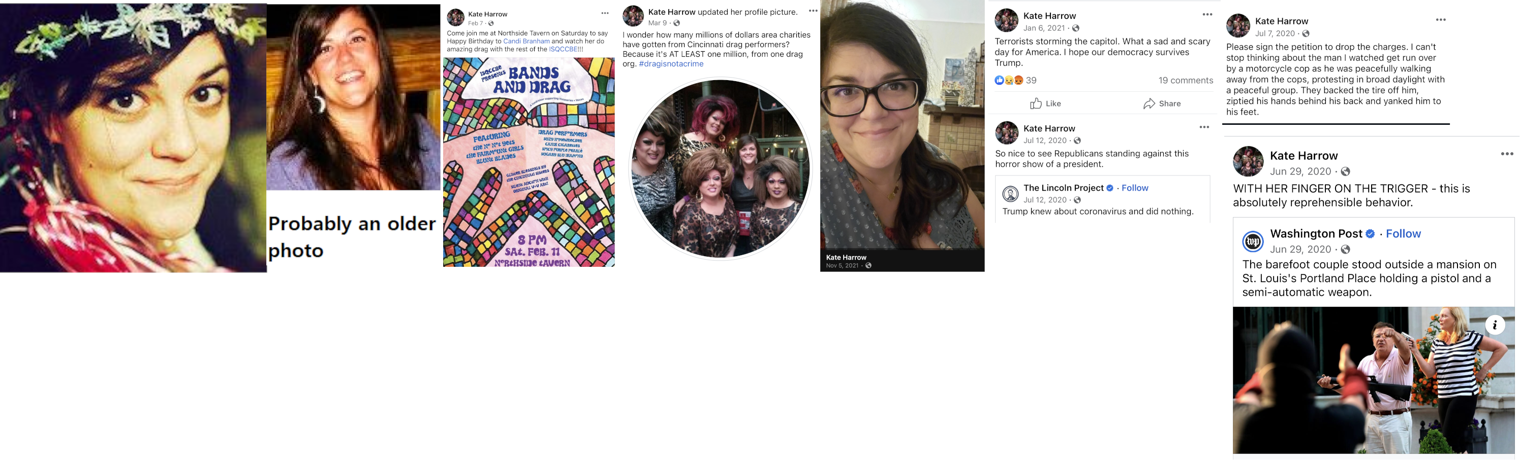 Katharine "Kate" Eliane Harrow (born Jul. '79) participated in a George Floyd riot in Cincinnati in May 2020. Rioters were illegally blocking a street and a motorcycle cop nearly collided with several. The mob immediately surrounded the cop who struck several rioters to keep them at bay. Ms. Harrow was struck in the forearm and complained it caused a bruise. She later filed a complaint against the CPD. The serious allegations were dismissed and only a procedural error was upheld by investigators. She works in marketing for media companies. She left Twitter for Mastodon because Elon was being mean to leftists. Based on her social media, she appears to really be into drag shows. Harrow lives in a house in the Mt. Airy neighborhood of Cincy. https://web.archive.org/web/20230220154540/https://www.cincinnati-oh.gov/ccia/completed-investigation-reports/2023-reports/february-completed-reports/20112-daulton-king/ (p. 62) @[email protected] https://www.flickr.com/photos/katharineharrow/