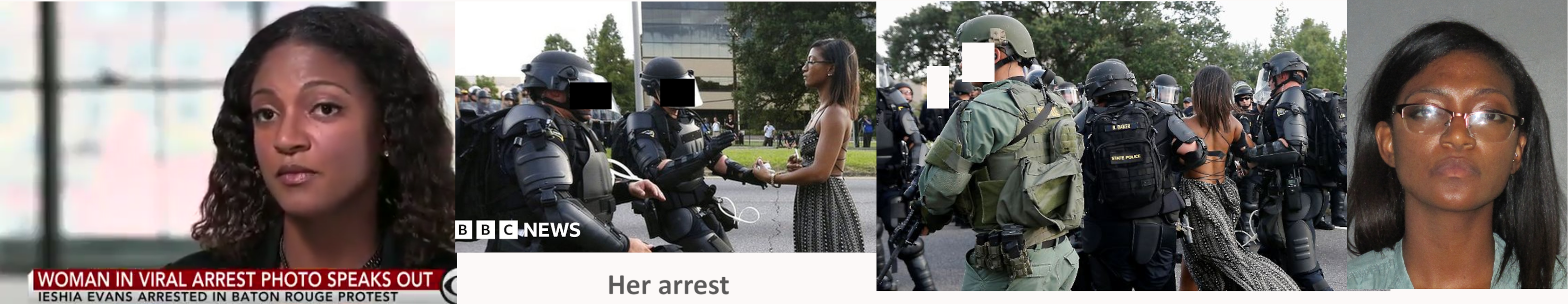 She traveled from Pennsylvania to participate in a 2016 riot in Baton Rouge and was arrested and charged with obstructing a highway. The riot was held in honor of an armed black man who was shot dead by white police officers. She was the subject of a photo that the MSM dubbed "iconic". The left-wing Guardian newspaper went nuts over the photo, metaphorically ejaculating "She is a Botticelli nymph attacked by Star Wars baddies" and "the camera has revealed a near-supernatural radiance protecting Evans, as if her goodness were a force field." Evans was later named AfroAmerica Network Black Woman of the Year for 2016. Evans works as a nurse. She's a native of Brooklyn who was living in Pennsylvania at the time of her arrest. https://archive.ph/0Shhh#selection-3049.0-3049.12 https://en.wikipedia.org/wiki/Taking_a_Stand_in_Baton_Rouge