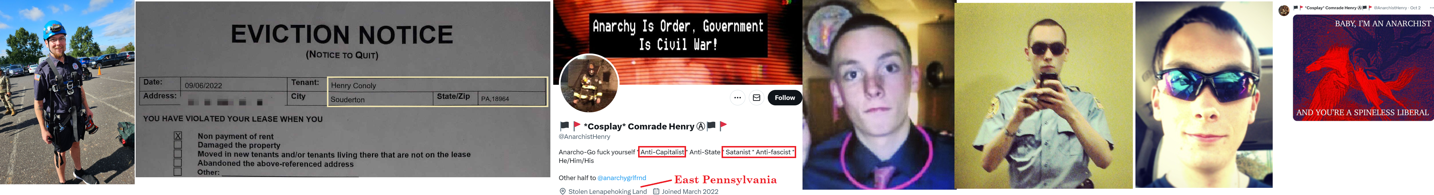 Henry William Conoly (born Jan. '93) a self-proclaimed satanist, anti-capitalist and anarchist from Pennsylvania. We found his real name because he linked to his girlfriend's Twitter account, and she helpfully posted an image of an eviction notice with his name on it. He's a fireman, probably a volunteer but possibly a professional. I guess he's preparing himself for Hell. His girlfriend is Amanda Cressman who is also an anarchist. He works as an auto parts tech. Conoly was living in Souderton, north of Philly, as recently as the summer of '23 but he has a history of evictions. See pics for backup.