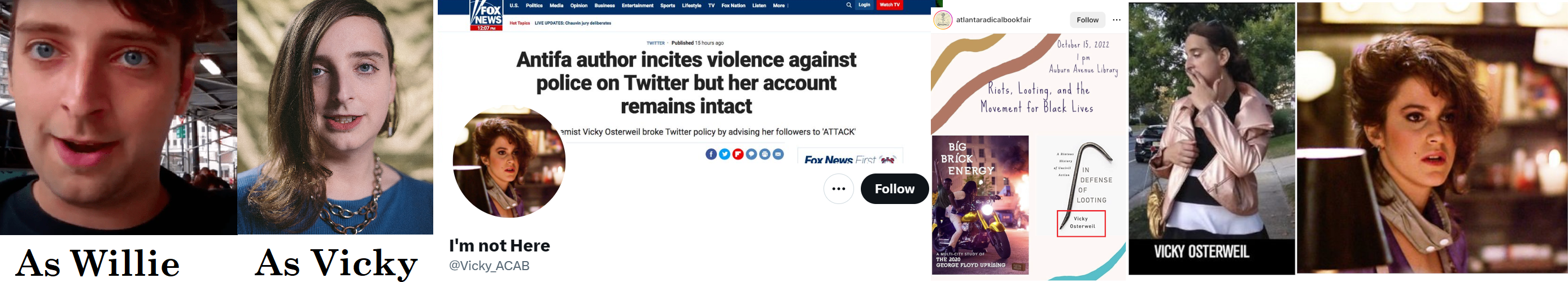Vicky Osterweil, nee William "Willie" H. Osterweil (born Dec. '85) is a tranny who wrote a book titled "In Defense of Looting". The book seems to have caused quite a stir when it was published. It argued in the book that looting is a tool that results in positive change to society and that looting helps redistribute property and wealth in an unequal society. Its book was published in 2019 and may have contributed to the violence at the 2020 riots. Osterweil advocates violence and gave a lecture called "Against Nonviolence". It also signed a statement of solidarity with the Atlanta Forest Defenders. It lives in a rowhouse in West Philly. https://web.archive.org/web/20230813123937/https://defendtheatlantaforest.org/solidarity/ https://archive.ph/BBtdN https://en.wikipedia.org/wiki/In_Defense_of_Looting https://vickyosterweil.substack.com/