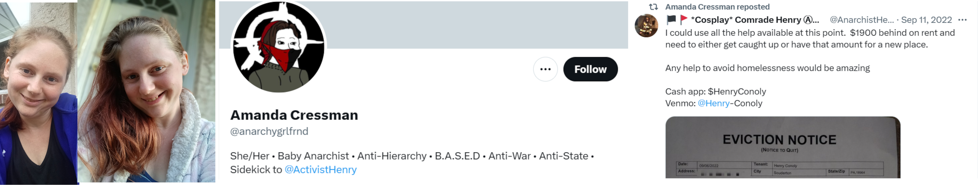 She's a Pennsylvania anarchist and the girlfriend of satanic anarchist Henry Conoly. She appears to have been living with Conoly in Souderton as recently as 2022. We found her because Conoly linked to her Twitter account, and she posted an eviction notice in his name. See pics for backup.