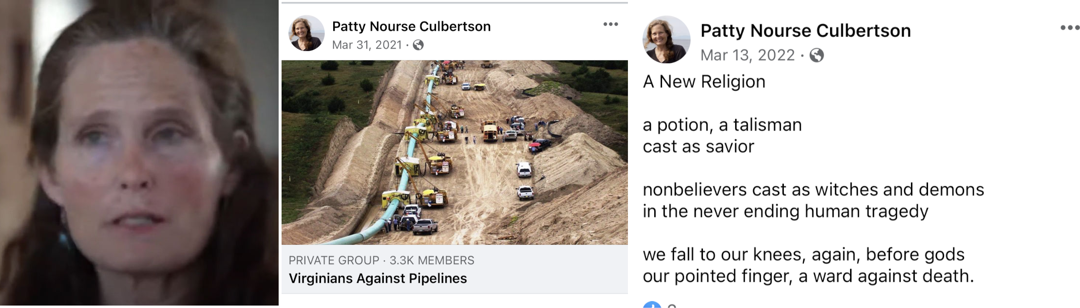 Patty Nourse Culbertson (DOB: 08/19/58) participated in the Unite the Right violent counter-protest and claimed to have been a "non-violent" participant. She took her daughter with her to the riot. In 2016, she raised money to buy winter gear for Standing Rock protesters and drove to the protest to deliver it although it's unclear if she actually participated in the illegal protests. Culbertson has ties to the DSA on social media and may be a member. She claims to come from a military family. Culbertson may be into mysticism or witchcraft and runs a blog called "Holy Witchery" and she's posted several weird poems or spells on Facebook. She lives out in the country near Charlottesville. https://archive.ph/gRFOZ, https://archive.ph/SSsy2, https://archive.ph/3nOGF https://www.youtube.com/watch?v=o_FA7OWsQhk&ab_channel=ARTivismVirginia https://pattyculbertson.substack.com/