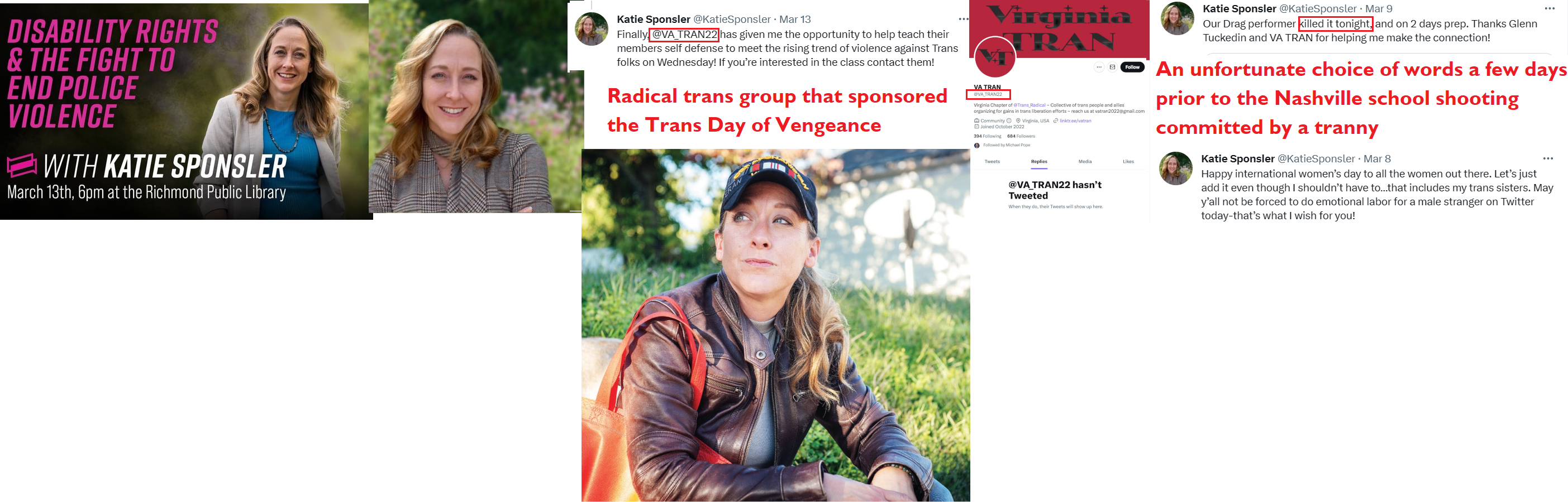 Katie Ann Sponsler (born Aug. '80) is a trans sympathizer affiliated with the radical Trans Radical Activist Network (TRAN). In March 2023, she led a martial arts course for the group's Virginia chapter. The course was offered shortly before a tranny shot up a Nashville school and a few weeks prior to the planned Trans Day of Vengeance in D.C. Sponsler is also known for advocating defunding the police and she called cops murderers. Sponsler ran for the Virginia House as a Democrat. She served in the USAF and later worked as a park ranger. She doesn't appear to be trans herself, just an "ally". Sponsler lives in a nice house in the Richmond suburb of Colonial Heights. https://archive.ph/vvXiZ#selection-1529.0-1529.14