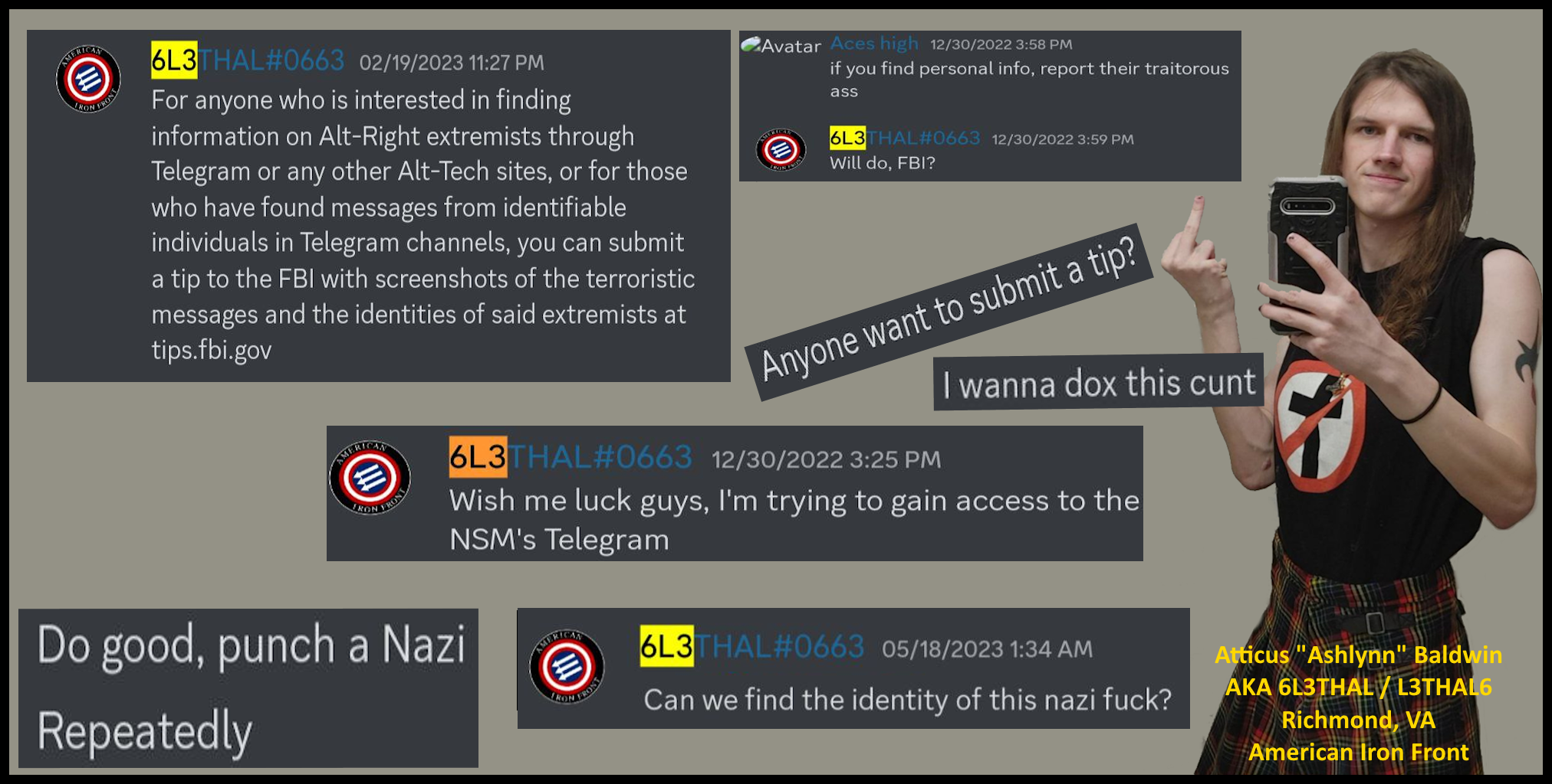 According to the Justice Report, Atticus “Ashlynn” Baldwin is an "antifa" doxer and member of the American Iron Front (AIF) who worked as an informant for the FBI. Sources: https://justicereport.news/articles/2023/12/28/antifa-infiltrator-doxxer-and-fbi-informant-unmasked-as-autistic-transsexual-video-gamer/ https://wmkinstitute.com/american-iron-front-discord-server-leaked-by-patriot-youth/ According to his Instagram, he is a photographer "both IRL and virtually". He plays VRChat exclusively where he performs his virtual "photoshoots". Duolingo: https://www.duolingo.com/profile/6L3THAL PayPal: https://www.paypal.com/paypalme/6L3THAL Chess: https://www.chess.com/member/6L3THAL Reddit: https://www.reddit.com/user/6L3THAL Instagram: https://www.instagram.com/6l3thal/ YouTube: https://www.youtube.com/@6l3thal9 Fiverr: https://www.fiverr.com/l3thal6 Discord: 6L3THAL@8673
