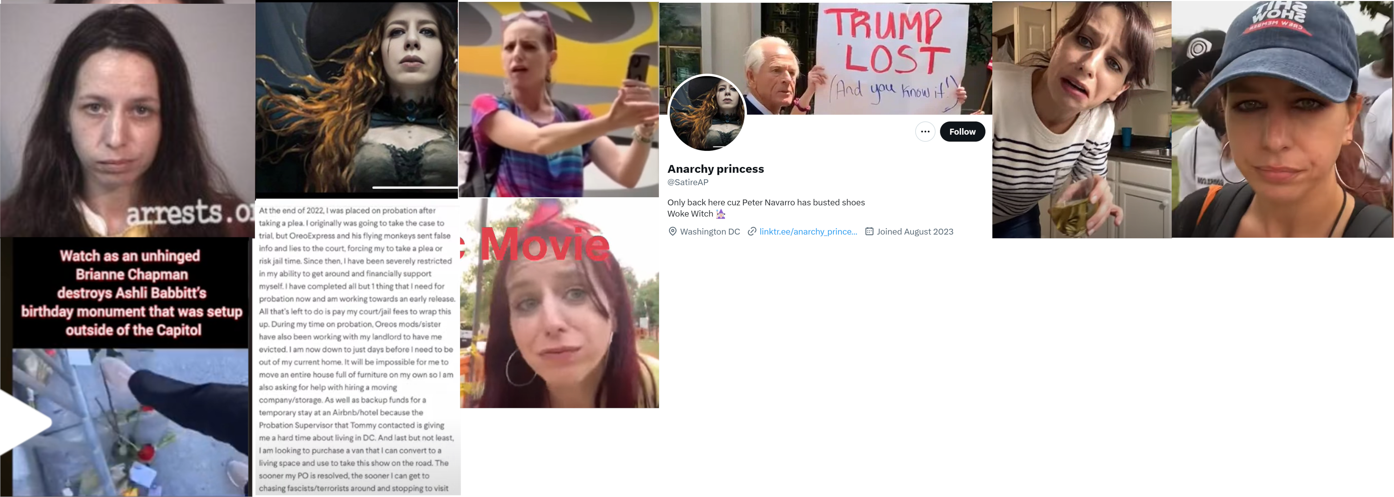 Brianne Marie Chapman, aka “Anarchy Princess”, (born Jun. ’85) is an anarchist and an unhinged loon who harasses conservatives and is in a social media war with several semi-prominent social media personalities. She even has her own parody account. Despite the fact she's a stalker, she tried to get a stalking order against the guy who runs the conservative Oreo Express account on YT. Chapman traveled to Florida to harass people at Trump's indictment. She's seen on video destroying Capitol riot martyr Ashli Babbit's birthday memorial outside the Capitol building. She said, "F**k Ashli Babbitt" and called her a bitch. She allegedly works as a prostitute at times, but she doesn't have any arrest records for dealing P. Her children were allegedly removed from her custody. Chapman describes herself as a woke witch. When she works, it's as a waitress. She claims to live in DC but we're fairly certain she lives in a dumpy looking apartment complex in Fredericksburg. https://www.youtube.com/watch?v=kzLeJrubRRc&ab_channel=AnarchyPrinccess https://www.tiktok.com/@stephanie_frey/video/7155986298120015146 https://www.youtube.com/watch?v=-Ii9fEzLg94&ab_channel=OreoExpress https://www.youtube.com/watch?v=VR4BIR-Fwcc&ab_channel=OreoExpress https://archive.ph/HYh86 https://linktr.ee/anarchy_princess_ https://www.twitch.tv/anarchy_princess_