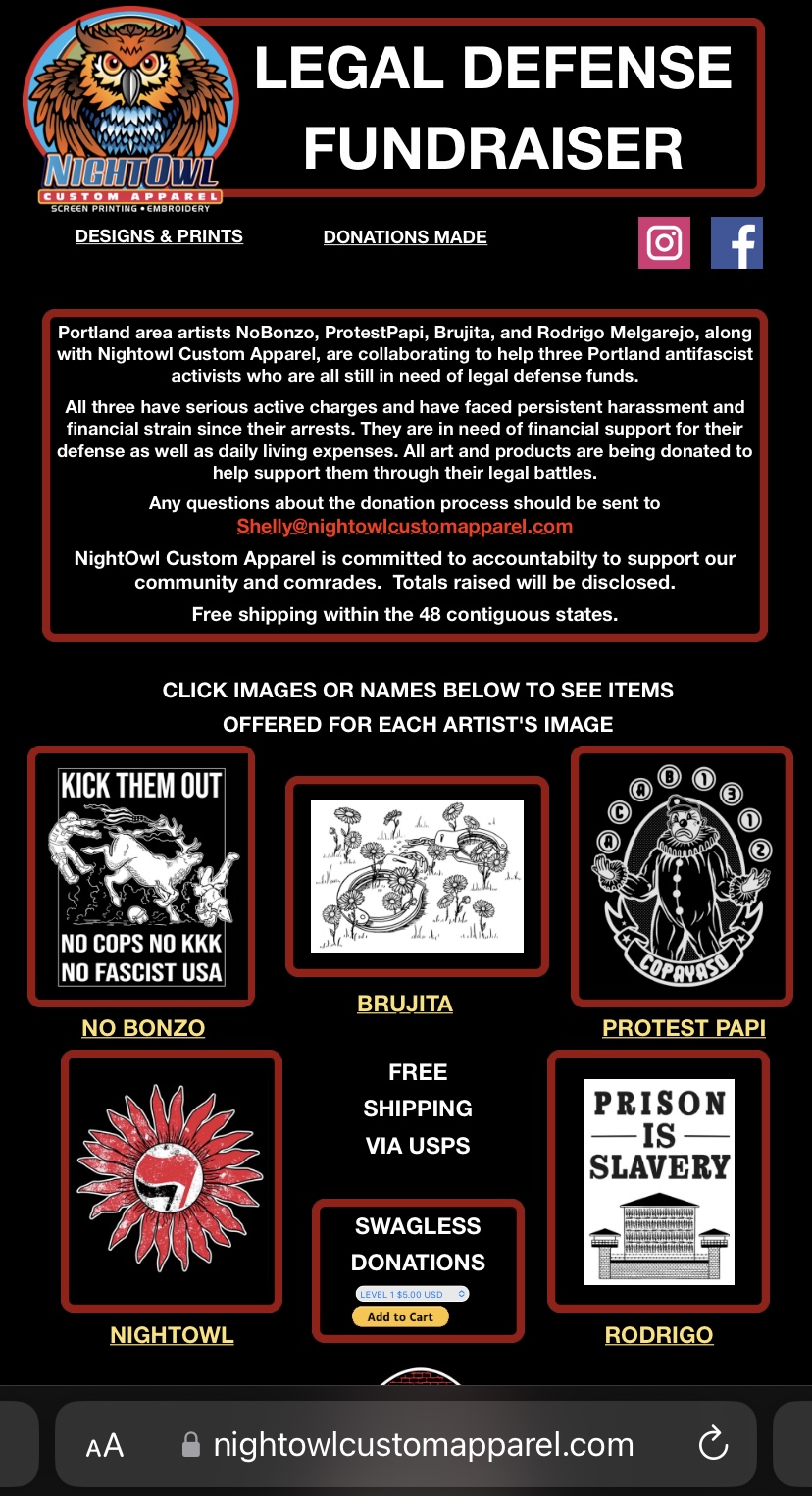 This website is doing fundraising for antifa court fees. Following the money there would be a great way to oust commie donors. LLC registered in oregon to Michelle 'Shelly' Hill and her husband Paul. http://records.sos.state.or.us/ORSOSWebDrawer/Recordhtml/3435993 https://egov.sos.state.or.us/br/pkg_web_name_srch_inq.show_detl?p_be_rsn=1712582&p_srce=BR_INQ&p_print=FALSE https://nightowlcustomapparel.com/legal_defense-.html Full name: Michelle Ann Hill (DOB: 12/29/71). Her Facebook is interesting. She seems to be buds with Claire Cassidy (https://antifawatch.net/ViewReport/319e23b4) of Laser Bloc as well as Team Racoon PDX which is kind of an Antifa street charity. Hill often sets up a booth at weekend markets in Portland such as the Queer and Trans Artist market. She made t-shirts for a fundraiser for T-Rex who was killed at an Antifa riot. She lives with her husband in Northeast Portland near Argay Park. https://twitter.com/nightowl_custom
