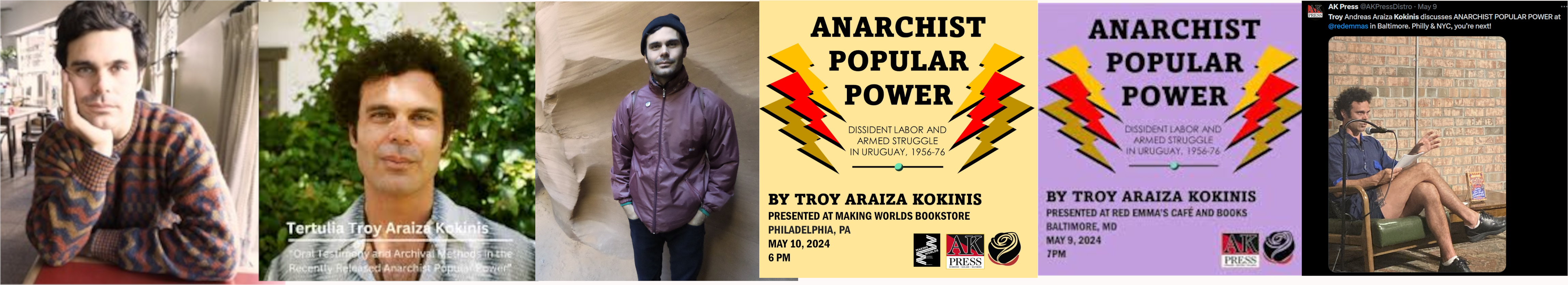 Troy Andreas Ariaza Kokinis (Born Jun '88) is a lecturer at the University of California - San Diego who wrote a book titled, "Anarchist Popular Power: Dissident Labor and Armed Struggle in Uruguay, 1956-76‘. He went on a tour to promote the book and gave lectures at several anarchist bookstores including Red Emma's in Baltimore. The Black Rose Anarchist Federation boosted his book. https://archive.is/geQUG https://www.youtube.com/watch?v=S8AHDXSGymc https://archive.is/9W7nq, https://archive.is/I47dy