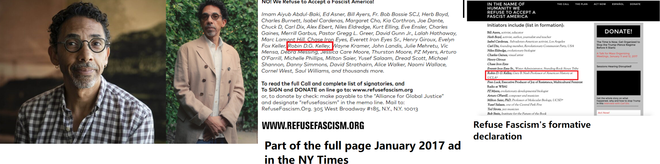 Robin Davis Gibran Kelley, who usually goes by Robin D.G. Kelley (DOB: 03/14/62) is a Marxist UCLA history professor associated with Refuse Fascism. He's described himself as, "a Marxist surrealist feminist who is not just anti something but pro-emancipation, pro-liberation." In January 2017, he was one of the signatories to a full-page ad in the NY Times sponsored by Refuse Fascism. The ad had the tag line "Stop the Trump/Pence Regime Before It Starts" so I suppose they were advocating an insurrection. Kelley isn't known to be directly affiliated with Antifa, but he wrote an article about the predecessors to Antifa. He was the primary force behind the republication of the book "Black Marxism" by Cedric Robinson. He also wrote a book titled "Hammer and Hoe" about communists in depression era Alabama. The term "Hoe" presumably refers to the farming tool. In addition to his job as a professor, he's had a few minor acting roles. The Marxist professor business must be profitable because he lives in a really nice $2.5 mil. home with his wife in west L.A. https://archive.ph/WUNhV https://archive.ph/nNVKw https://web.archive.org/web/20220811143537/https://refusefascism.org/wp-content/uploads/nyt-no-16-1-4.pdf(NY Times ad) https://en.wikipedia.org/wiki/Robin_Kelley