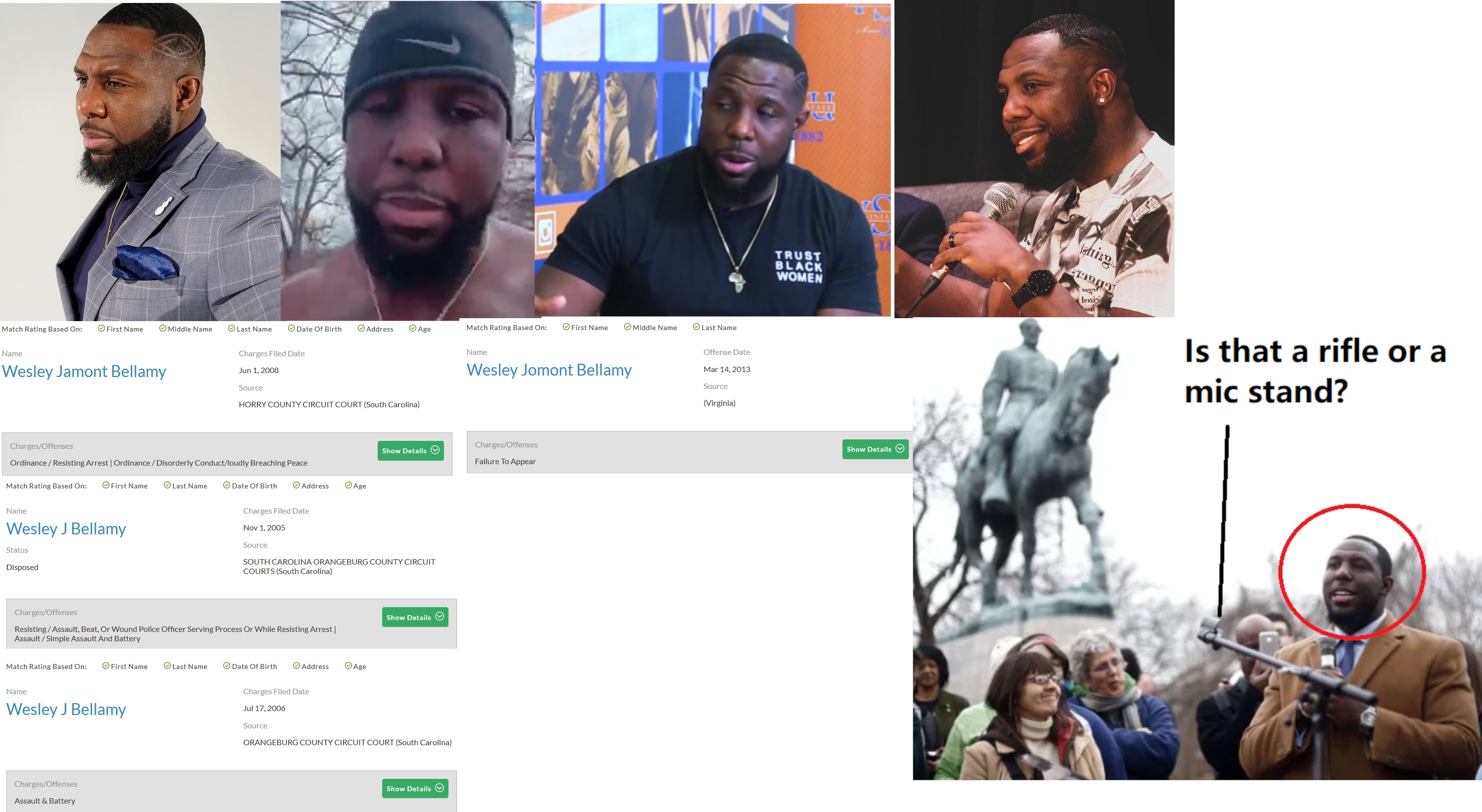 Wesley "Wes" Jomont Bellamy (DOB: 03/04/86) attended the Charlottesville Unite the Right counter protest and spoke at a gathering at a Baptist Church. Bellamy spearheaded the movement to remove Lee's statue from a Charlottesville park which set off the 2017 violence. Jason Kessler led an effort to remove Bellamy from the City Council. In 2021, he was arrested at the U.S. Capitol in a voting rights protest. Bellamy has numerous degrees from HBCUs including business degrees from South Carolina State University and a PhD from Virginia State. He's the former Vice Mayor of Charlottesville. Bellamy was also Co-Chair of Our Black Party, a political party organized by P. Diddy. He wrote a book titled: "When White Supremacy Knocks, Fight Back! How White People Can Use Their Privilege, and How Black People Can Use Their Power". Bellamy has numerous arrests including several for crimes including assault and battery on a police officer, assault and battery, resisting arrest, disorderly conduct and failure to appear. As of 2022, he was the chair of the Poly-Sci Department at Virginia State University. He named his daughter Stokely after the back radical Stokely Carmichael. Bellamy lives with his family in a Charlottesville home he owns with his wife. https://archive.vn/9vU6z, https://archive.vn/xBQG3, https://archive.vn/DgmCv, https://archive.vn/Q5VmM https://archive.vn/S4w3D#selection-1551.58-1551.96 https://archive.vn/V0vlT#selection-703.28-703.35 https://linktr.ee/drwesbellamy