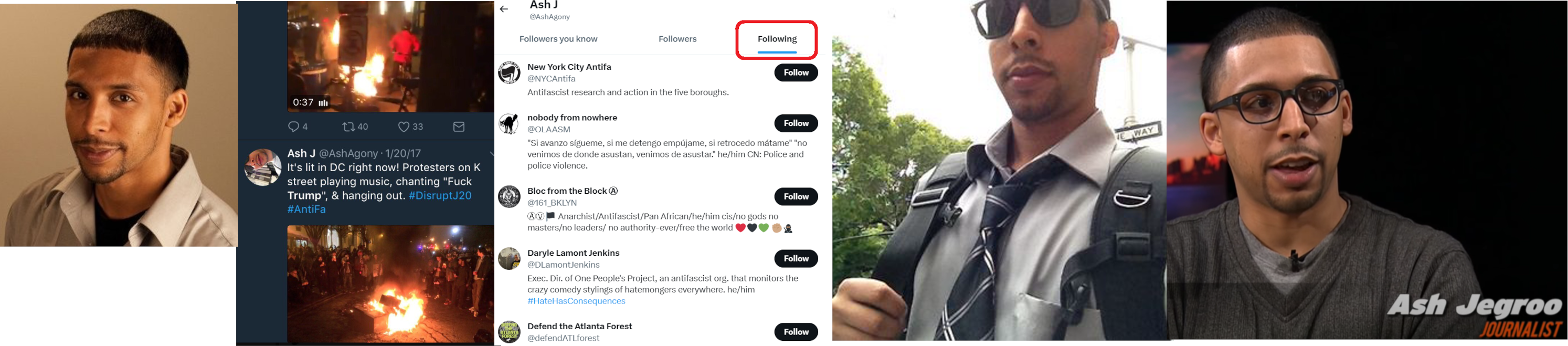 Ashoka S. Jegroo (born Nov. '85) is a fake journalist who participated in the J20 inauguration riots in 2017 and gleefully posted pictures on social media. He doesn't appear to have been arrested at J20. Jegroo is affiliated with the left-wing police watch group Cop Watch. He filmed and photographed numerous New York protests and riots during the period after George Floyd's demise. Jegroo has a fairly influential left-wing Twitter account with nearly 19K followers. He follows a huge number of Antifa accounts on Twitter include Defend the Atlanta Forest and doxxer Daryle Jenkins. He claims to be a journalist and has a journalism degree from CUNY's journalism school. His last known address was in Brooklyn. https://archive.ph/5VAdR https://archive.ph/Cl6Ob https://www.youtube.com/watch?v=DfQEMJN5Kj4&ab_channel=BRICTV https://www.linkedin.com/in/ashoka-jegroo-b01bb857