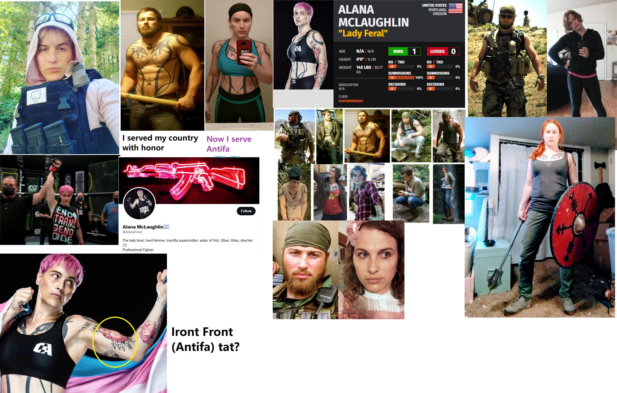 Alana McLaughlin (formerly Ryan Anthony McLaughlin), AKA "Lady Feral" (DOB: 06/26/83) is a M>F trans and former special forces medic who's affiliated with left-wing gun groups. McLaughlin was featured in an article about Lefty LGBTQ people with guns although Portland isn't known to have an SRA or JBGC chapter. It's a pro MMA fighter and it claims to have handled security at a 2017 LGBTQ rally in Portland and to have chocked out Patriot Prayer's Joey Gibson. It was apparently queer from an early age, although it looks very masculine in pre-transition photos. McLaughlin grew up in a conservative family in South Carolina that sent it to conversion therapy and tried to make it more masculine. It joined the military in an effort to become more manly. Its mother said she'd rather McLaughlin die in battle than live as a fag. After separating from the military it moved from North Carolina to Portland because NC isn't trans friendly. Its career as an MMA fighter makes one wonder if it "transitioned" because it was easier to beat up girls as a dude than to beat up other men. McLaughlin dropped a huge amount of weight after transitioning and now weighs in at a slight 145 lb. It has a huge stylized dragon tribal tattoo on its torso. It also has a tat on its left arm of what appears to be the three Iron Front (Antifa) arrows piercing a heart. Still in search of a beaver of its own, it lives in the Portland suburb of Beaverton. It trains at a gym in Florida. https://archive.ph/07Ce4, https://en.wikipedia.org/wiki/Alana_McLaughlin, https://lady-feral.tumblr.com/ https://www.youtube.com/watch?v=7G1tHA6I4Q4&list=PLSMsKUk5Z21ZmC976OkXqH4c8Ta8CAxI0&ab_channel=truly May have moved to Asheville, NC