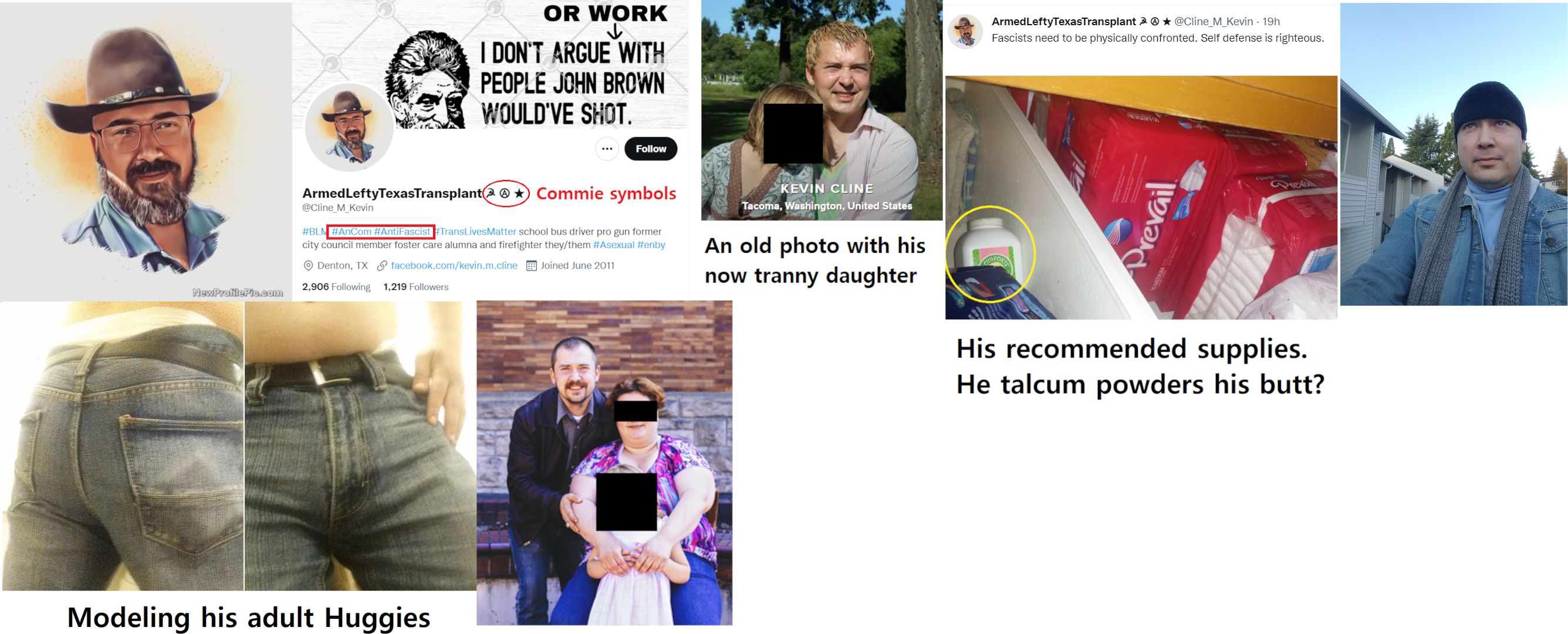 Kevin Michael Cline (DOB: 10/04/82) is a gun-toting, asexual, enby, anarchist commie. At one time in the early 2010s, he claimed to be trans, but he looks to have "de-transitioned". Cline is probably connected to the JBGC, possibly the Elm Fork chapter in Dallas. He re-Tweets a lot of JBGC garbage and follows many of their chapters. Cline has a 16-year-old biological female daughter who's a F>M trans. Most Antifa who wear diapers do it for weird sexual reasons but he's incontinent and has to wear diapers. He even ran an adult diaper blog for a few years (see link). Most Antifa sh*t their pants metaphorically when they see the right approaching but this guy does it literally. If you see a JBGC member at a tranny protest in the Dallas area with a wet spot in the front or brown in the back, it's probably Cline. I suppose there are advantages to wearing diapers to a riot. He can probably hide a gun and several clips in his diaper and it's somewhere cops won't search. Cline lived in the Seattle area for years but appears to have moved to Texas in 2021. He's worked mostly for non-profits and his last job was as a coordinator for the AIDS Housing Association of Tacoma. He lives in an RV park in Aubry near Denton, Texas. https://web.archive.org/web/2/http://diaperdad.weebly.com/about-me.html Kevin Cline threatened to kill himself on Twitter last month and stream it if people didn't send him enough cash aid in his cash app to pay his rent. He didn't do it; he's still reposting pro-Palestinian, anti-capitalism stuff as recently as today. Some of his social media accounts are under JD Cline. For years, he's been asking for money on Twitter and Facebook for various emergencies. He had two GoFundMes in 2023 alone. Cline works as a school bus driver part-time in Denton. He's also got a 16-year-old daughter in his care. https://www.facebook.com/kevin.m.cline?mibextid=ZbWKwL There were stories about him in the Denton Record-Chronicle in July, 2022, and the Current Revolt in December, 2022.