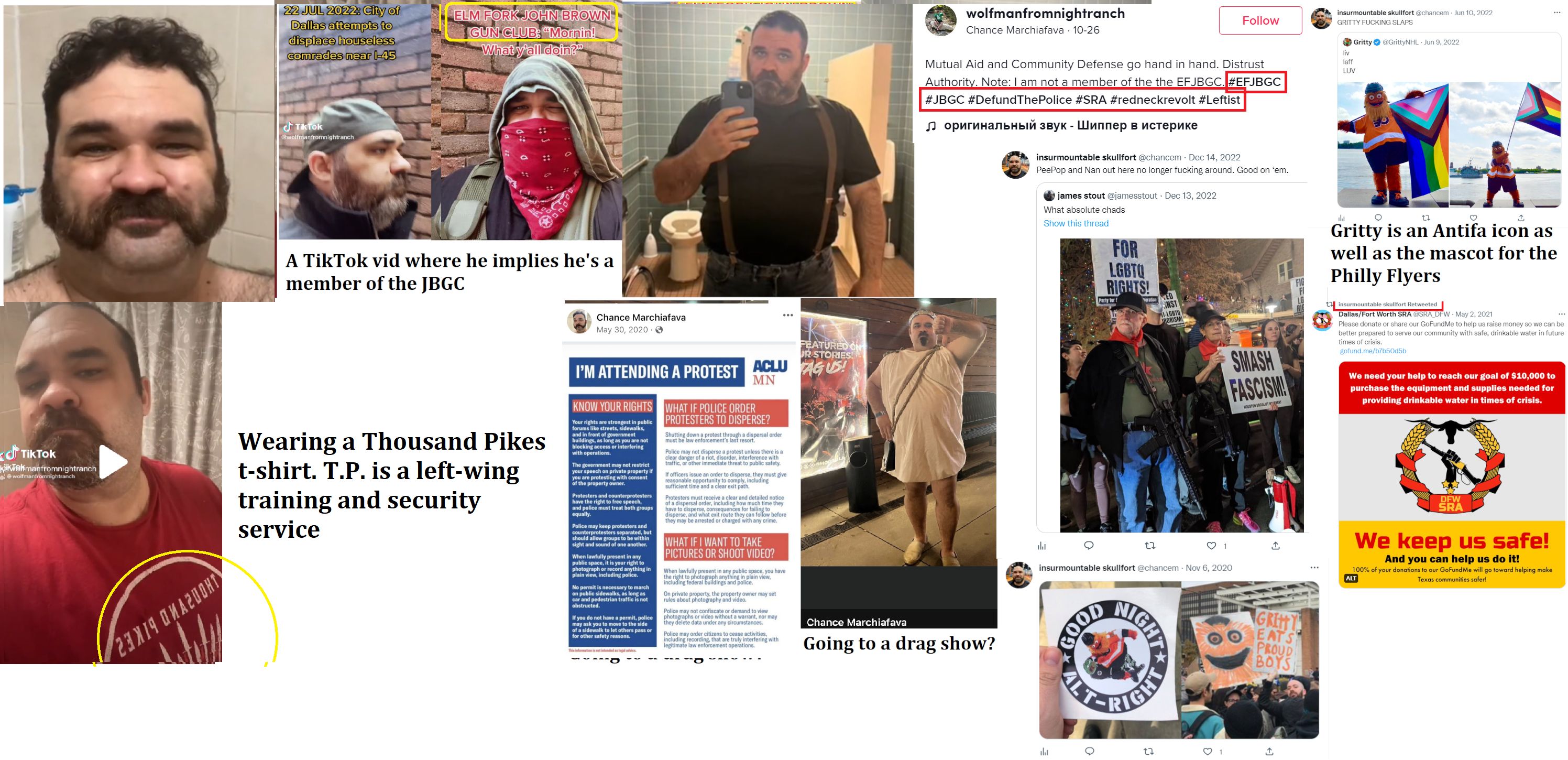 Chance Joseph Marchiafava, aka Wolfman, (DOB: 06/25/85) is a probable member of the Elm Fork John Brown Gun Club of Dallas. He posted a TikTok vid in which he implied he agreed with the Elm Fork JBGC's interference in a July 2022 Dallas police homeless sweep. He's seen in the video wearing a plate carrier and a bandana as a mask. Marchiafava claims on TikTok that he's not a member of the JBGC but he tags the JBGC, SRA and Redneck Revolt on the vid. He's wearing a Thousand Pikes t-shirt in another video. T.P. is a left-wing training and security business. He's also re-Tweeted fundraisers sponsored by the DFW SRA. If he's not a JBGC member, he's an ally or a wannabe. There's no evidence he attended Dallas George Floyd riots, but he helpfully posted an ACLU guide to rioters' rights on Facebook in May 2020 during the initial BLM George Floyd themed riots. He also has a photo on Facebook that appears to show him in drag and carrying a purse, or it could possibly be a toga outfit for a party. If the former, then it's possible the JBGC is providing undercover security at Dallas area drag shows. He's larger than the typical Antifa soy boi and may stand out in a crowd, even when masked. He spends a lot of time grooming his beard and has changed its style several times. Marchiafava is from south Louisiana originally but is a big hockey fan so go figure. He works as a medic and lives in a townhome in the Dallas suburb of Garland. https://www.tiktok.com/@wolfmanfromnightranch/video/7158832121698667819?is_copy_url=1&is_from_webapp=v1 (His JBGC vid)