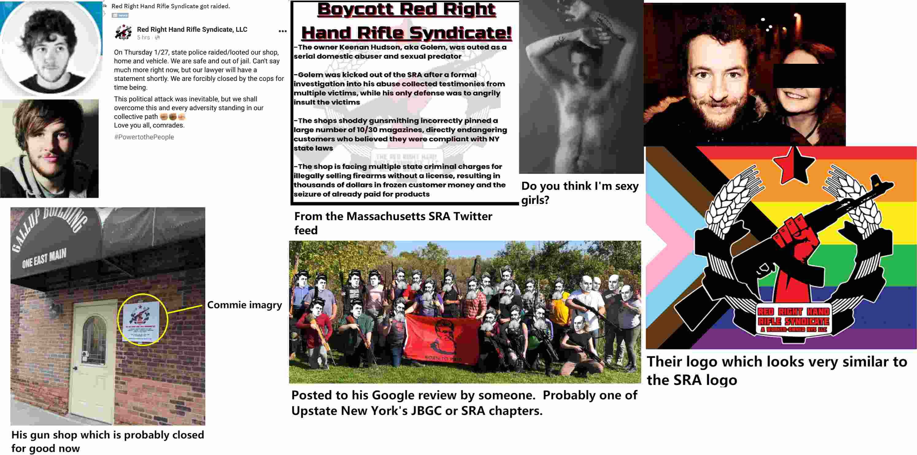 AKA Keen Hudson, AKA "Golem", he's an accused sex abuser and former SRA member who was kicked out of the SRA due to credible sex abuse allegations. He owned a gun store known as the Red Right Hand Rifle Syndicate. The shop was raided by NY state police in January 2022 and they seem to have gone dark on social media. There was chatter on various gun forums that Keenan didn't have an FFL as gun dealers are required by law to possess. Hudson claims on his LinkedIn page to have the Type 08 license needed to import firearms but said nothing about having the Type 01 or 02 licenses which are required to sell firearms. Posters on one of the SRA forums claimed he was charged for operating an SRA militia training ground. Given that it was the state police and not the ATF who raided the shop, Hudson may be facing state charges. He's currently out of jail. The store, or perhaps the shop's workers, started a Change.org petition to have Uvalde cops charged as accomplices in the school shooting. Hudson was also working as a male model but his career was interrupted by his arrest. He should have gotten some fashion tips from the homo models as his fashion tastes are questionable and he showed up to one gun show wearing camo spandex tights. His shop was in Victor in upstate New York near Rochester and he presumably lives in the area. https://archive.ph/5XCAC (Gun message board) https://archive.ph/RkAXO (SRA message board) https://archive.ph/eBDKw (Petition) https://archive.ph/wWk41 https://archive.ph/Rtqji (Legal gun dealers in Victor, NY) https://gvo.news/victor-gun-store-owners-revealed-as-antifa-left-wing-extremists/