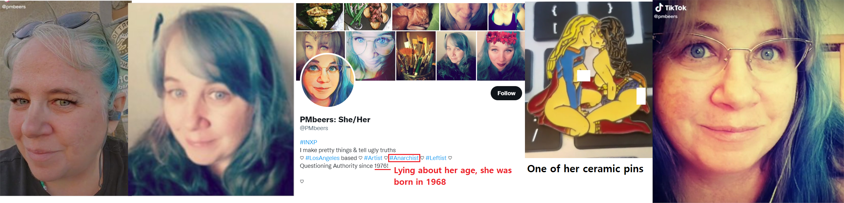 Patricia "Patti" Michelle Beers, aka PM Beers, (DOB: 09/25/68) is a radical anti-police ceramic artist who self-identifies as an anarchist. She was active in the Occupy movement and streamed some Occupy events. Beers claimed on her website that all cops are bastards because they're willing to enforce laws that "oppress" poor people. She's a social media gadfly and is active on Twitter, TikTok, YT and others. She was part of some sort of left-wing project known as Anti-Media and lost her old Twitter account during a Twitter purge of bot accounts. Beers has a few minor criminal infractions, but they appear to have been dismissed. Beers lives in L.A. in an apartment near Cal State-LA. She seems to be sensitive about her age and lies about her year of birth on her Twitter profile and uses old photos in her social media accounts. https://pmbeers.org/ https://www.linkedin.com/in/patti-beers-788b5883 https://www.minds.com/pmbeers/ https://www.patreon.com/Pmbeers