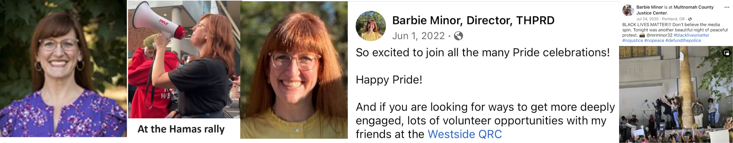 Barbie Ruth Minor (born Mar. '77) is a marketing executive for Columbia Sportswear who, according the Andy Ngo, attended the 2020 riots in Portland. In November 2023, she was recorded at a pro-Hamas rally where she used a microphone to shout that Hama's terrorist attacks were justified. She's on the Board of Directors of the Tualatin Hills Park and Recreation District. She's also a member, possibly an officer, of Love Grows, LLC which seems to be some sort of farmers' market group. Minor lives in a rather ordinary house in the Portland suburb of Beaverton. https://archive.ph/745bn https://twitter.com/i/status/1724475367811915856 (Vid) https://www.linkedin.com/in/barbieminor https://www.barbieminor.com/ https://www.thprd.org/district-information/board-of-directors