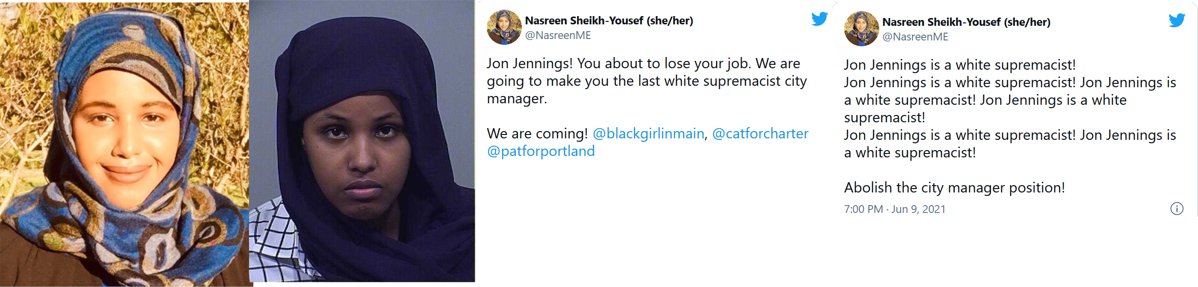Nasreen Sheikhyousef, aka Nasreen Sheikh Yousef, is a radical who was arrested at a BLM protest in Portland, Maine in 2016. She was charged with obstructing a roadway. She was working as an organizer for a group known as "Black POWER". She was active in Portland's BLM protests in 2020. Sheikhyousef was elected to the Portland (Maine) city commission in 2021. Her campaign photos appear to have significantly lightened her facial complexion. After she was elected, she played the white supremacy trope, using Twitter to accuse the city manager of being a white supremacist. She thought the city manager's position was racist because the KKK supposedly created the position in the 1920s. She was later the subject of a recall campaign. She was one of the politicians pushing a Portland ordinance to allow non-citizens to vote, something that's illegal under Maine law. She claims to have been a child slave who escaped an arranged marriage in Africa. Sheikhyousef lives in the Portland area. https://archive.ph/ZIYLE#selection-2591.0-2591.20 https://archive.md/oC7Fm, https://archive.md/OE4Si, https://archive.ph/4NS8h