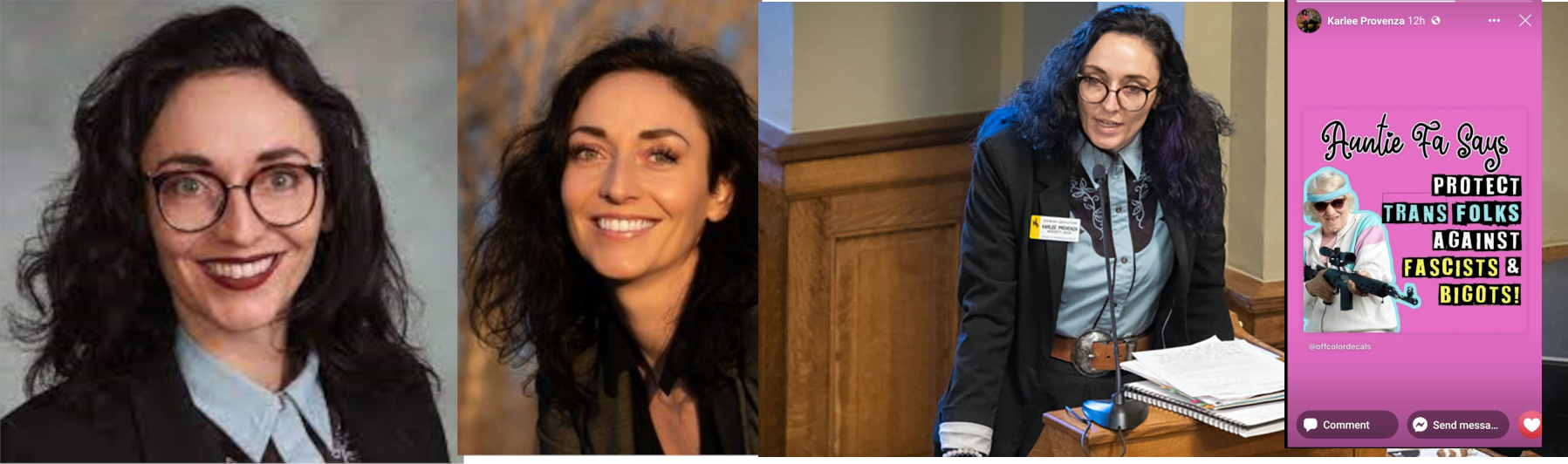 Karlee Rae Provenza (born Oct. '89) is a left-wing Wyoming Democrat state representative and university lecturer who posted bizarre videos to social media appearing to advocate violence against people who don't like transgenders. This was shortly after a F>M trans killed several normal children in a Nashville school and around the time of the Trans Day of Vengeance. She later was condemned by the Wyoming Speaker of the House. Provenza is an instructor at the University of Wyoming and claims to be an expert in rural police reform. Provenza has a PhD in experimental psychology and law. Although she looks a bit manish in some photos, there's no evidence she's trans herself. https://archive.ph/EBVwn https://archive.ph/UveZH https://archive.ph/A3Y6C https://www.karleeprovenza.com/
