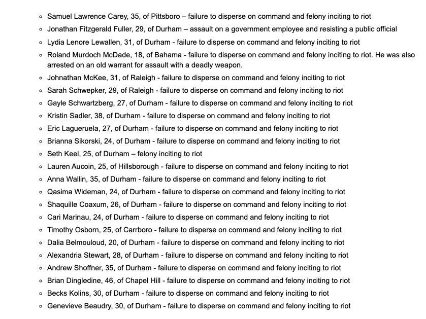 https://abc11.com/durham-police-department-vandalism-arrests-dpd-hq-protest/6324571/ https://durhamnc.gov/CivicAlerts.aspx?AID=2508 Samuel Lawrence Carey, 35, of Pittsboro – failure to disperse on command and felony inciting to riot