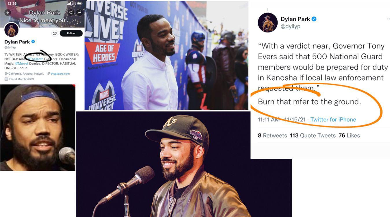 Dylan Elihayu Jafar Park-Pettiford (DOB: 11/27/84) is a TV screen writer for "68 Whisky", director and author who posted calls to burn Kenosha on Twitter. He Tweeted: "Burn that mfer to the ground" and “White privilege is illegally carrying a weapon to an event with the intent to use it, murdering two people, then getting up on the stand and crying about being the victim. (And of course he’ll be acquitted.)." And, “I would not be surprised in the least if this judge had white robes in his closet too.” Previously, he called critics of the Shang-Chi film "racist incels." (involuntary celibates, i.e. people who can't get laid). In 2017 he spoke out against Trump administration immigration policies saying, "We've gone 50 years back in time in less than two weeks." Despite all the money he's presumably making, he lives in an apartment near Santa Monica. He's probably more BLM than hardcore Antifa but he's still a radical. https://archive.vn/g4eSA https://archive.vn/L8vbe https://archive.vn/1Ca4U