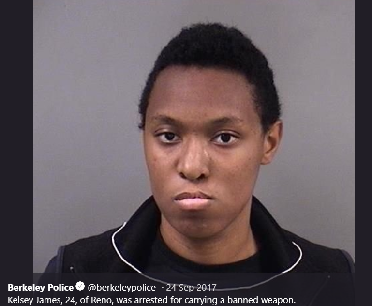 https://www.eastbaytimes.com/2017/09/25/eleven-arrested-in-berkeley-demonstration-sunday/ Kelsey James, 24, of Reno, was arrested for carrying a banned weapon. (Berkeley Police Department)