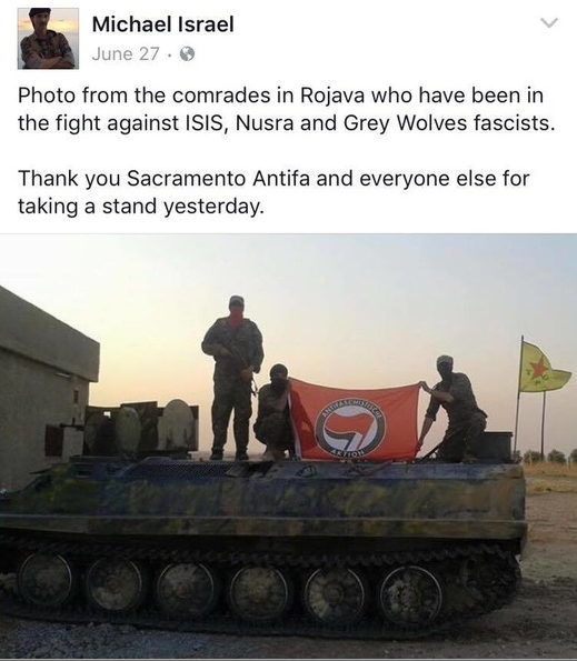 According to anarcho-terrorist webzine It's Going Down, "antifa" member Michael Israel was killed by a Turkish airstrike in 2017 while fighting in Syria with the Kurdish YPG. According to the article "Michael was also involved throughout the years in local groups such as the Motherlode Progressives, Occupy Sacramento, Sacramento IWW, the Anti-War Movement, SEIU, and the Democratic Socialists of America." Sources: https://itsgoingdown.org/memorial-fund-launched-help-us-honor-michael-israel-fallen-ypg-volunteer/ https://itsgoingdown.org/body-ypg-volunteer-michael-israel-returns-us-laid-rest/