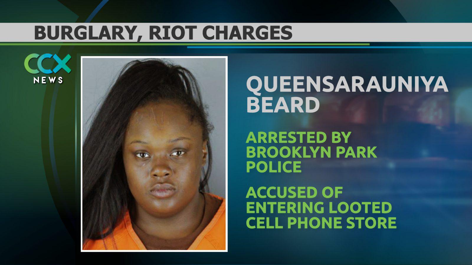 https://ccxmedia.org/news/list-of-local-suspects-charged-after-burglary-riot-arrests/ Queensarauniya Beard, 24 of Brooklyn Center, arrested May 29 by Brooklyn Park police, charged with 3rd-degree burglary, 3rd-degree riot