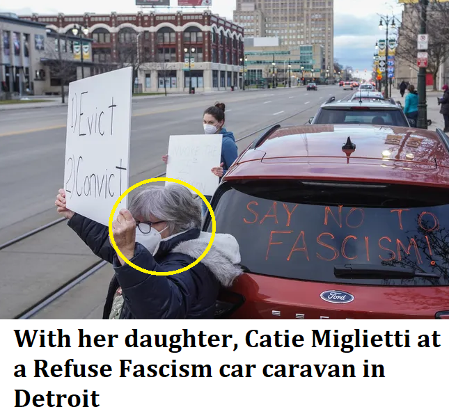 Cathleen "Catie" Michelle Miglietti rode with her mother, Michelle Coleman, in a Refuse Fascism sponsored car caravan protest in Detroit in January 2021. Refuse Fascism is part of the Revolutionary Communist Party network. Miglietti is a Registered Nurse. She lives in the Detroit suburb of Plymouth. https://archive.ph/2LTnL#selection-507.55-507.70