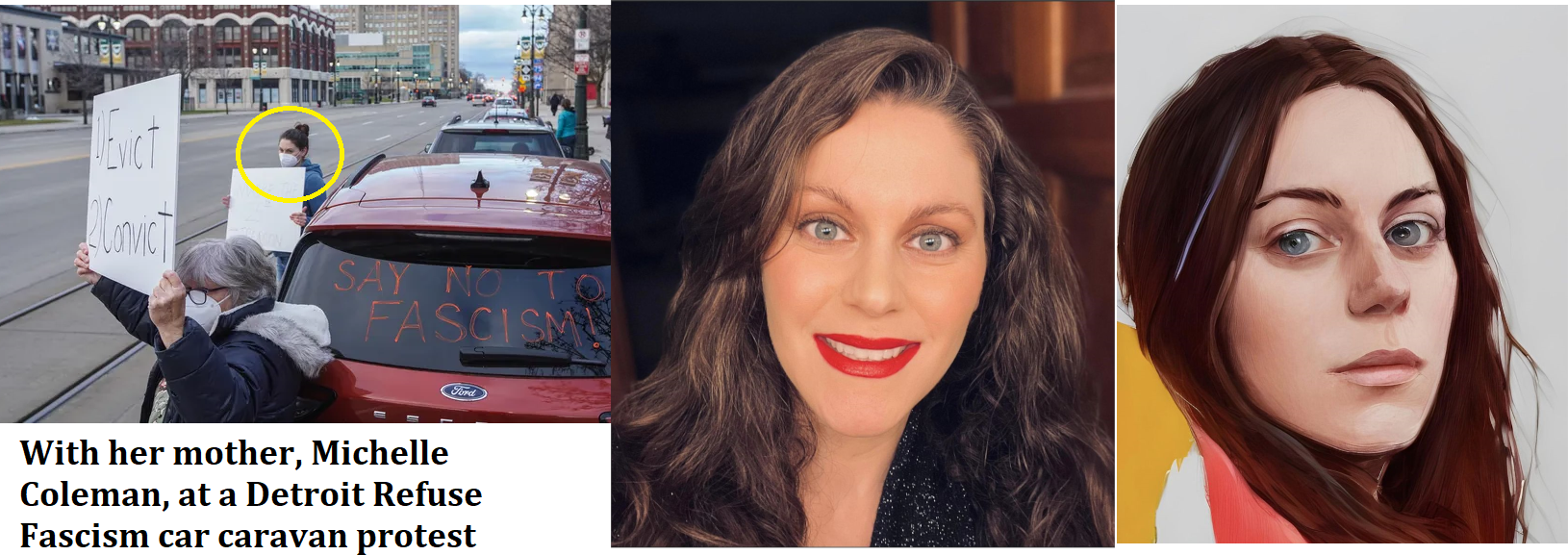 Michelle Lynn Coleman (DOB: 09/18/56) participated in a Refuse Fascism car caravan protest in January 2021 in Detroit. Her daughter, Cate Miglietti, rode with her. Refuse Fascism is a subsidiary of the Revolutionary Communist Party. Her only criminal offense is for failing to confine her dog, but she has a 2019 bankruptcy. https://archive.ph/2LTnL#selection-507.0-507.16