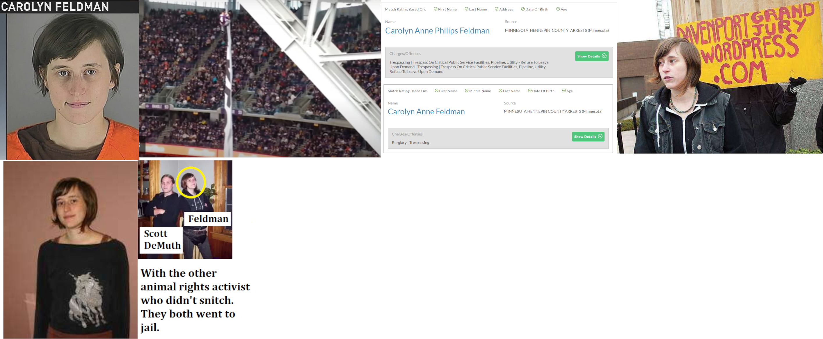 Carolyn "Carrie" Anne Feldman (DOB: 03/30/89) is an environmental radical. In 2017, she assisted two other radicals in disrupting a Minnesota Vikings game where they hung a banner from the rafters. Feldman doesn't appear to have done any climbing. Maybe she's afraid of heights. The protesters were protesting stadium sponsor US Bank's financing of fracking. Feldman was charged with obstructing the legal process, burglary and trespassing. Previously, in 2009, she was called to testify before a Federal grand jury investigating an "animal liberation" event by the Animal Liberation Front. Feldman refused to testify and was held in contempt of court and sent to jail for a while. Her refusal to snitch got her a story in the anarchist Fire to the Prisons newsletter. She was arrested for hanging a banner from a Minneapolis bridge in 2013 and was charged with trespassing on critical public service facilities. When she's not protesting fracking, she may work in property management. She owns a large Victorian home in the Ventura Village neighborhood of Minneapolis with Eryn Trimmer (https://antifawatch.net/ViewReport/99292e14), a radical who was one of the RNC 8. The house seems to be some sort of safe house for Minneapolis radicals and there are reportedly nearly twenty people living there. RNC alumnus and Trimmer's former, or possibly current girlfriend, Monica Bicking (https://antifawatch.net/ViewReport/30b17d83), also lives in the house as does pipeline protest arrestee Katie Woodward. Karl Zimmerman, who was one of the stadium protesters, also lives in the house. There are a few other suspected radicals living in her home, but we haven't had time to research them. There's more about this gal but I can't fit it in this submission. https://archive.ph/RfNvo https://archive.ph/sXRa5 https://archive.ph/FyoCZ https://web.archive.org/web/2/https://www.prisonlegalnews.org/media/publications/fire_to_the_prisons_issue_8_anarchist_quarterly_2010.pdf (p 60)