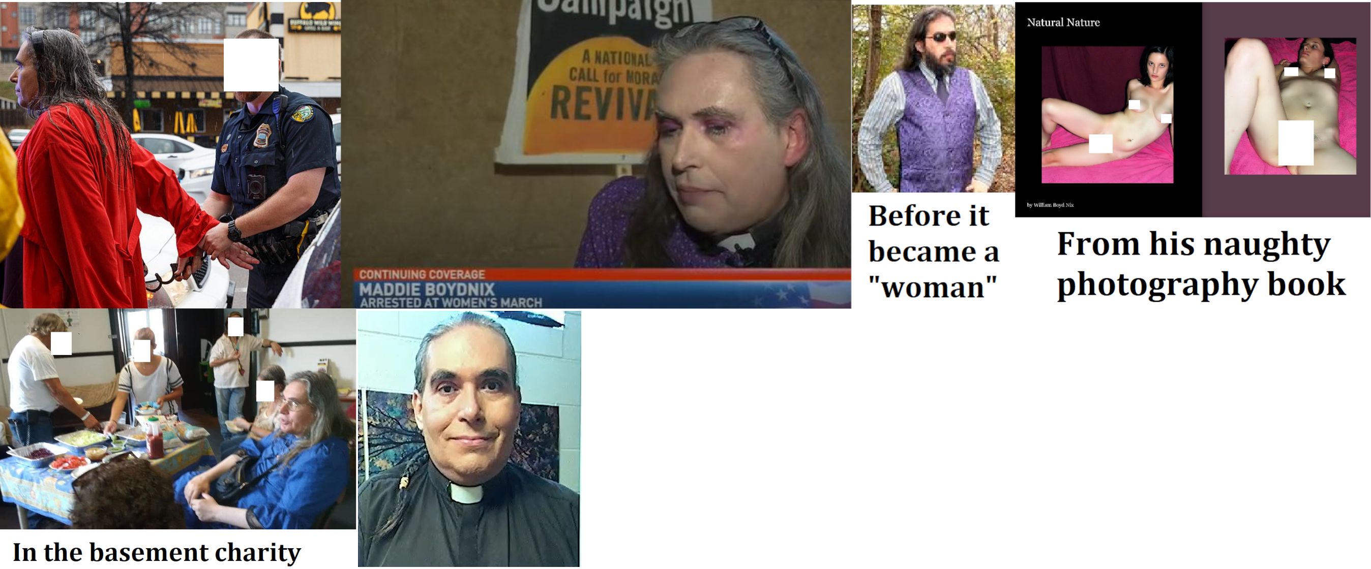 William Boyd Nix, aka Maddie Boyd Nix, aka Maddie BoydNix,(DOB: 10/17/69) is a transsexual who allegedly participated in the Charlottesville counter protest in 2017. It was later arrested at a Chattanooga women's march in 2019. It claims to be a minister and wears a clerical collar although it's unclear if Nix has been ordained. Nix runs a charity called Mercy Junction Justice and Peace Center. The charity operates out of a basement in the Pilgrim Congregational Church (UCC) parish hall. Nix doesn't show up in the church's staff directory, so Nix may be a fake priest. He seems to be an amateur or semi-professional photographer who's published several books with nude photos of women. Perhaps the bodies of the models inspired him to become a "woman". Too bad for Nix he'll never have a vagina like his models. Nix co-owns a home in north Chattanooga with an older woman who may be his mother. The house has a huge amount of junk in the yard. https://archive.ph/vLKSF (Nix's dirty photo books) https://archive.ph/DEqaZ https://archive.ph/69FyL https://archive.ph/OR9CB https://archive.ph/OB1a1 (UTR participants)