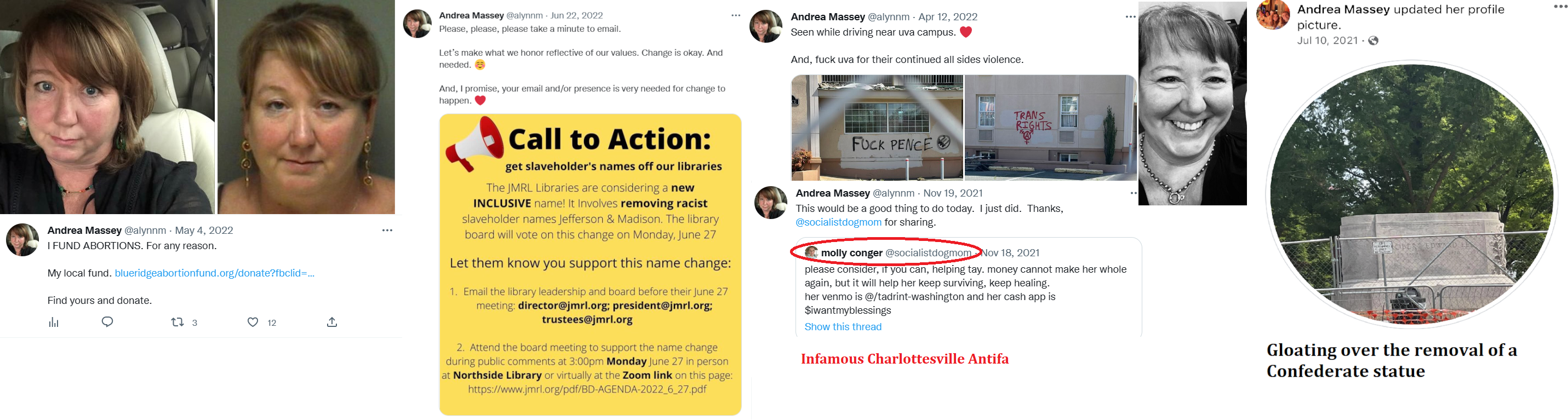 Andrea Lynn Massey (DOB: 09/14/69) is affiliated with the Hate-Free Schools Coalition of Albemarle County and was arrested at a 2018 school board meeting. The radicals were protesting the supposed racism of the School Superintendent. During the protest, Massey ran into the room and started screaming. She was charged with trespassing. She seems to be one of the people pushing transgenderism in Virginia public schools. Massey also supports the Blue Ridge Abortion Fund, a charity that funds abortions for any reason. She's promoted donations to a group run by a D.C. anarchist. In the summer of 2022, she pushed to have the "racist" Thomas Jefferson's name removed from a public library. She lives in a townhome in Charlottesville with a man who's probably her boyfriend. https://web.archive.org/web/20201022122831/https://www.c-ville.com/county-warning https://archive.ph/dxiHz https://archive.ph/7Sreg