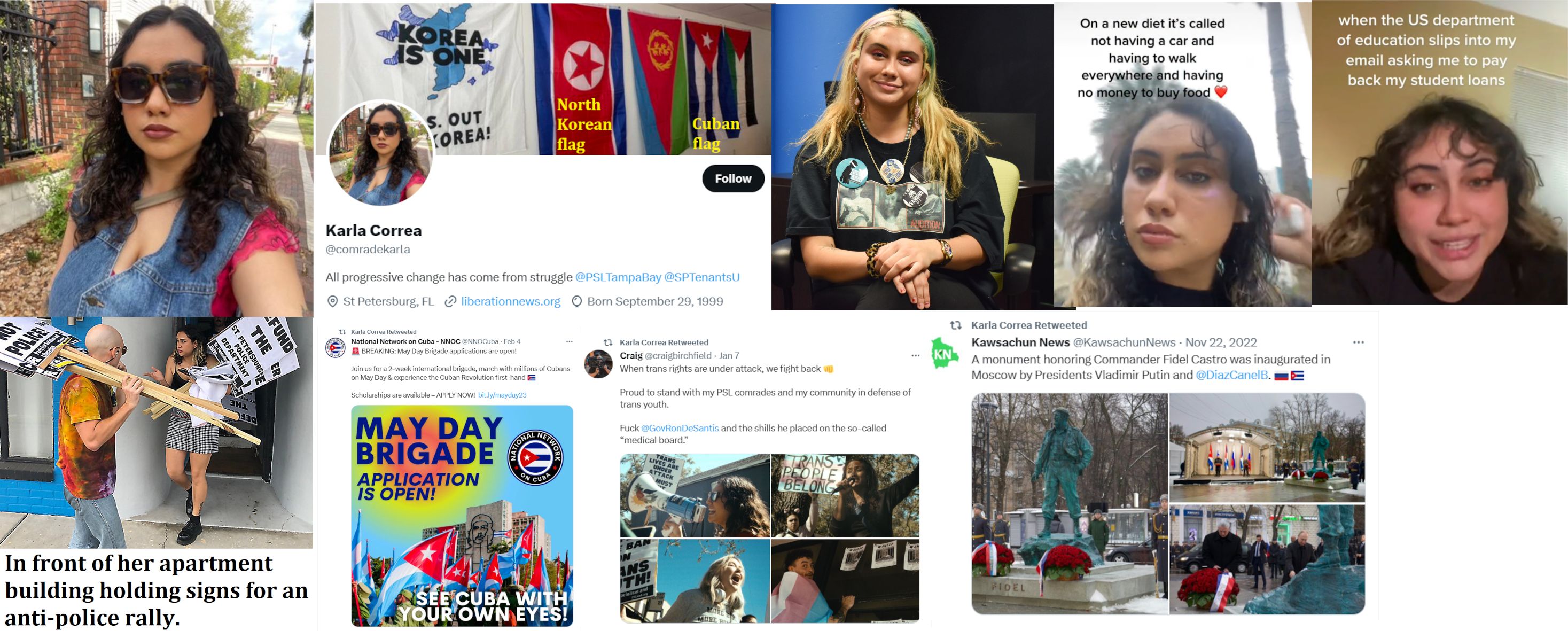 Karla Lucia Correa is a Tampa area communist. She flies several commie flags in her Twitter profile. Correa is a member of the Party for Socialism and Liberation. She seems to be active in tenants and anti-police protests. She uses her Twitter account to amplify left-wing Tweets. She was charged with obstructing a police investigation in 2020 while she was a student at the University of South Florida. She went through a pre-trial deferral process and was sentenced to community service and fined. The judge issued a restraining order prohibiting her from having contact with the officers. Correa has a degree in poly-sci from USF. She's really clever and chose "karl.amarx" as her Instagram ID. She lives in an apartment with a young man in a questionable looking building near downtown St. Petersburg. https://archive.ph/9295N https://archive.ph/Qm4Gf https://archive.ph/wFdNB